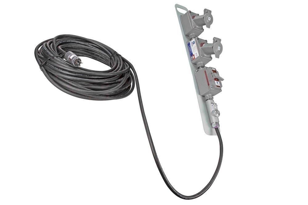 These units are constructed of 50 feet of 12/3 SOOW explosion proof cord and are rated at 20 amps of continuous service. The cord is chemical and abrasion resistant and comes with two Class I Division 1 explosion proof receptacles and switch installed on one end and a Class I Division 1 explosion proof plug installed on the other end. We also include an extra matching plug for operators to attach to their equipment which allows them to avoid any issues with plug and receptacle equipment compatibility with this cord.
