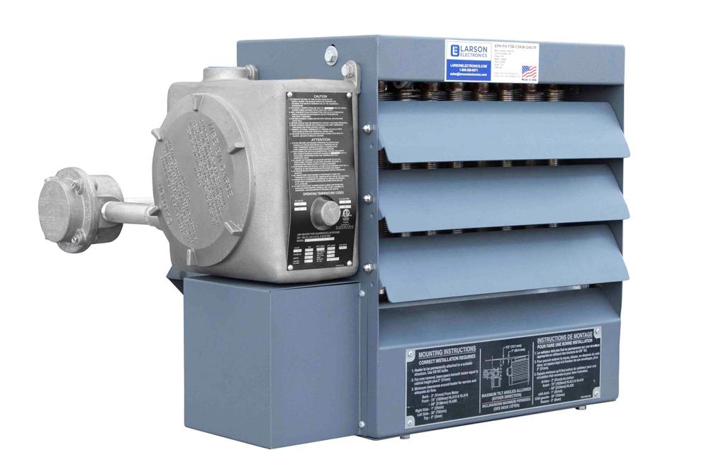 | The Larson Electronics EPH-FH-T3B-7.5KW-240.1P Hazardous Location Fan provides active heating in hazardous locations and cold-temperature work sites. This 7,500-watt forced fan heater is compatible with 240V single phase and features an airflow rate of 580 CFM (24` air throw). The EPH-FH-T3B-7.5KW-240.1P is suitable for maintaining adequate temperatures in Class I, Divisions 1 & 2 and Class II, Divisions 1 & 2 work sites. This 7,500-watt fan forced heater operates on 240V single phase with 24V control voltage. The 33.6-amp rated unit supports an airflow rate of 580 CFM, capable of throwing air as far as 24 feet. This T3A temperature-rated fan features guard shields to protect internal, moving parts. This hazardous location fan forced heater is constructed of 14 gauge steel and aluminum with stainless steel/aluminum pressure relief valves. The unit is rated for 6,000 cycles of service. Versatile louvers allow operators to control the direction of air leaving the fan in real-time. For protection from freeze damage (up to -45° C), the unit utilizes a Ethylene Glycol to water mixture as a heat transfer fluid inside the heater core. Mounting: The recommended mounting height for this hazardous location unit is 8 feet. Applications: Heating, manufacturing plants, chemical processing, cold-temperature facilities, farming operations, agricultural sites, flour processing, grain silos and more.  |