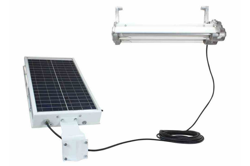 | Made in Texas The EPL-24-2L-LV-SOL-60C Explosion Proof Solar Power LED light fixture from Larson Electronics is the ideal lighting solution for remote areas and standalone applications where connection to external power is either impractical or unavailable. This powerful yet compact hazardous location light delivers crisp, clean light while reducing operating costs. Charged by the 30 watt solar panel, two 12V AC 8aH sealed lead acid batteries provide constant, reliable power to the 2 tube, 28 watt fixture. The EPL-24-2L-LV-SOL-60C ships with a convenient 60€™ of 12/2 SOOW cord connecting the solar panel to the light fixture which allows operators to position the panel where the most ambient light is available. Light Features: This 2 foot long, 2 LED tube, explosion proof solar light fixture is ideal for use in remote locations requiring powerful yet compact hazardous location lighting. The EPL-24-2L-LV-SOL-60C features our second generation LED T-series 14 watt T17 style lamps which produce 15% more illumination at 8 feet as compared to standard T8 lamps when measured with an Extech light meter. Our LED-T series bulbs are visibly brighter than standard T8s and have consistently surprised many of our customers with their unexpectedly high light output levels. We have eliminated the ballast box normally associated with fluorescent fixtures which reduces overall weight, creates a slimmer unit profile, and helps this LED fixture maintain a T-6 temperature rating. The solid state design of the LED lamps gives this fixture superior resistance to damage from vibrations and extremes in temperature as well as a lamp service life over twice that of standard T8 bulbs. | |||||||