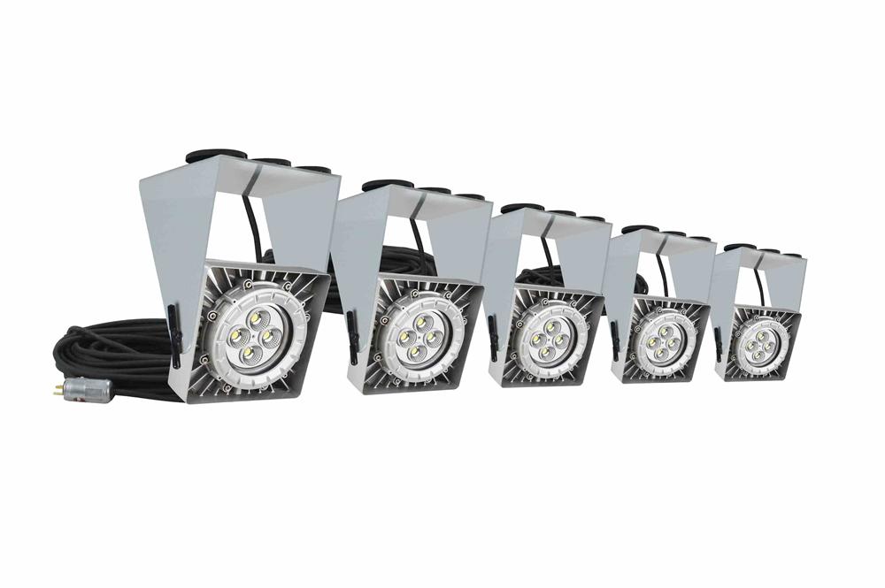 This unit incorporates five explosion proof 50 watt LED lamps connected in series and is suitable for use in areas where petrochemical vapors and various dusts are present. The cast aluminum housings, tempered glass lens, and abrasion resistant cord make this a very durable unit that will resist damage from chemicals, abrasion, vibrations and impacts. This string lighting solution will provide the lighting you require in a flexible, easy to manage configuration for job site illumination. The lamps can be moved around and mounted to different points within the work area. The lights, however must remain within 10 feet of one other.