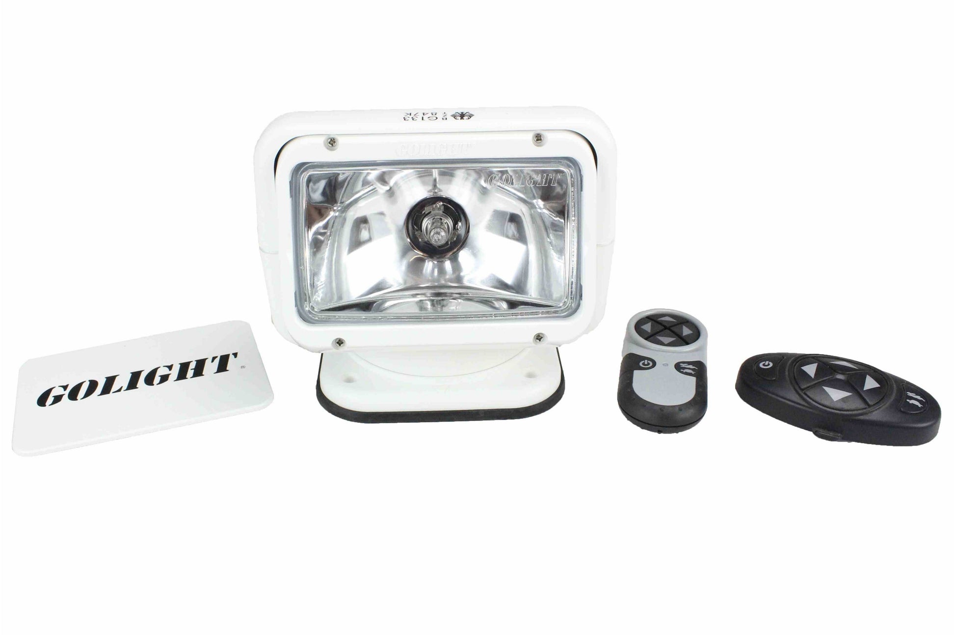 The GL-2007 Golight Radioray Remote Control Spotlight with Dual Wireless Remotes from Larson Electronics produces a 1,300 lumen light beam capable of reaching over 700 feet in distance. This 65 watt Golight offers wireless remote pan and tilt control, a portable handheld remote control, a wireless dash mount remote control and a housing finished in a durable white finish. This Golight is weatherproof with a weatherproof remote control and operates with 12 Volt DC.