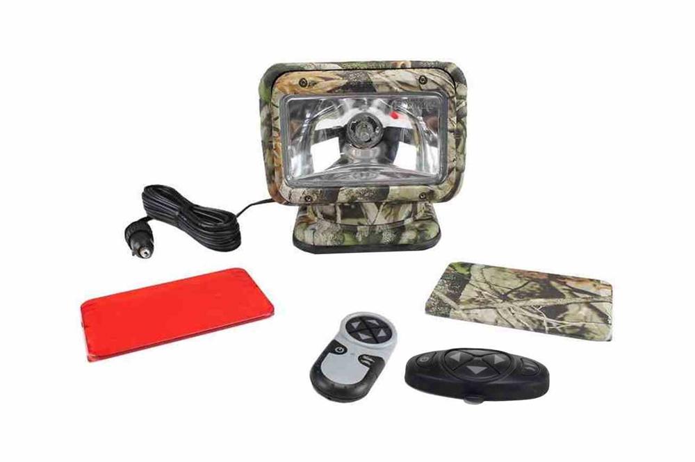 Remote Operation: Remote control functions include on/off and 4 buttons which control up, down, left and right movement. The light will continue movement as long as the buttons are pressed. Releasing the buttons stops movement and holds the Golight in position. A fast and slow mode button (turtle/hare) controls the speed of the motor while the pan and tilt function buttons are depressed. Holding the button for 12 seconds in fast mode results in pinpoint accuracy at distance and is approximately 35 seconds for full rotation and 20 seconds for full range of tilt.  Durability: The GL-2085 Golight Radioray is designed for hunting and demanding outdoor use with a weather resistant housing constructed of high quality ASA Luran thermoplastic that is heat resistant, impact resistant, UV resistant and able to withstand rugged use and abusive conditions. This particular Golight is camouflage in color, making it ideal for docks and buildings where an attractive appearance is desired. Remote movement of this spotlight is provided by an automotive grade internal motor, gear, and transmission assembly that is constructed of LEXAN, brass, and stainless steel to provide rust and corrosion resistance as well as long life and reliable operation. Mounting: The light is permanently mounted with four screws and a rubber gasket. The screws are included. Power: This light operates with 12 volts DC and draws 5.5 amps, making it ideal for consumer vehicles, boats, ATVs, and similar sources of 12 volt direct current. On this particular model, the light ends in a 1 foot pigtail with stripped and tinned leads. The operator is responsible for providing the wiring from the battery and/or fuse box to the light. 16 AWG is recommended. Light Output: The lamp in this Golight is a 65 watt Halogen Cr5 Pentabeam II bulb which produces 1,300 lumens. This lamp has a 6000K color temperature, giving it very good color rendering and contrasting properties and the ability to clearly and sharply illuminate objects at long distances. It produces a long, wide spot beam with an effective working beam 700 feet. This high power Golight is ideal for hunting, security, boating, law enforcement, emergency services, utilities, and anywhere high power and remote control functionality are desired.