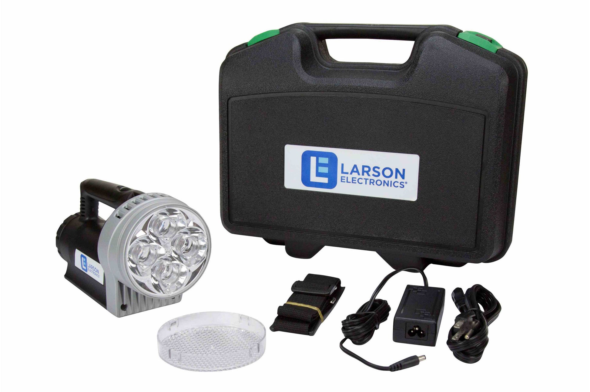 The GL-8130 is an LED searchlight with four 6W LED bulbs producing 2,500 lumens (approximately 15 million candlepower in a retail setting). A snap on diffuser lens is included in the blow mold style carrying case that enables the operator to convert the light to a soft, wide flood beam that covers an area 200 feet long and 200 feet wide. The GL-8130 LED searchlight is "instant on" and takes less than 2 seconds to come to full power and color and is rated for 50,000 hours of life.