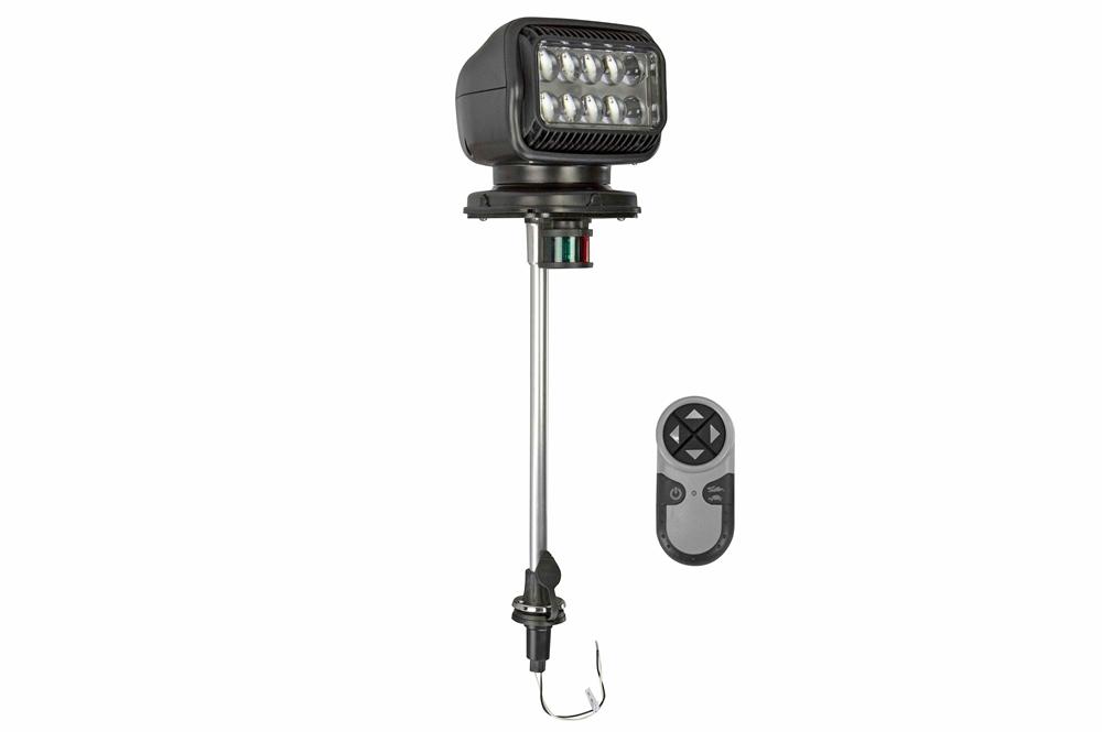| The GL-9110-18IN-18IN Golight LED Boat Light on Stanchion Mount from Larson Electronics produces a 2,520 lumen light beam capable of reaching over 900 feet in distance. This 36 watt LED Golight, which is mounted on an 18" pole, offers wireless remote pan and tilt control, a single handheld remote control, and a housing finished in a durable white finish. The unit is weatherproof with a weatherproof remote control and operates with 12 volt DC current.  The GL-9110-18IN Golight LED boat light is designed for use in all weather conditions and produces 2,520 lumens of intense light output. These units feature remote control operation that allows users to rotated the light 370 degrees with a hard stop and to adjust vertical tilt through 140 degrees. Remote operation is provided by one handheld wireless remote controller that operates over a radio frequency of 433 MHz. This remote includes an internal 12 volt battery rated at 1 year of operation and a single red LED to indicate remote control activity. The remote controller has a range of up to 150 feet and will operate through walls, within structures, and in vehicles. The remote is constructed of polycarbonate with rubber push pad buttons for weatherproof durability and can be user programmed to operate one or several lights simultaneously. Remotes are 3 inches long by 2 inches wide by 3/8 inch thick. | ||||||