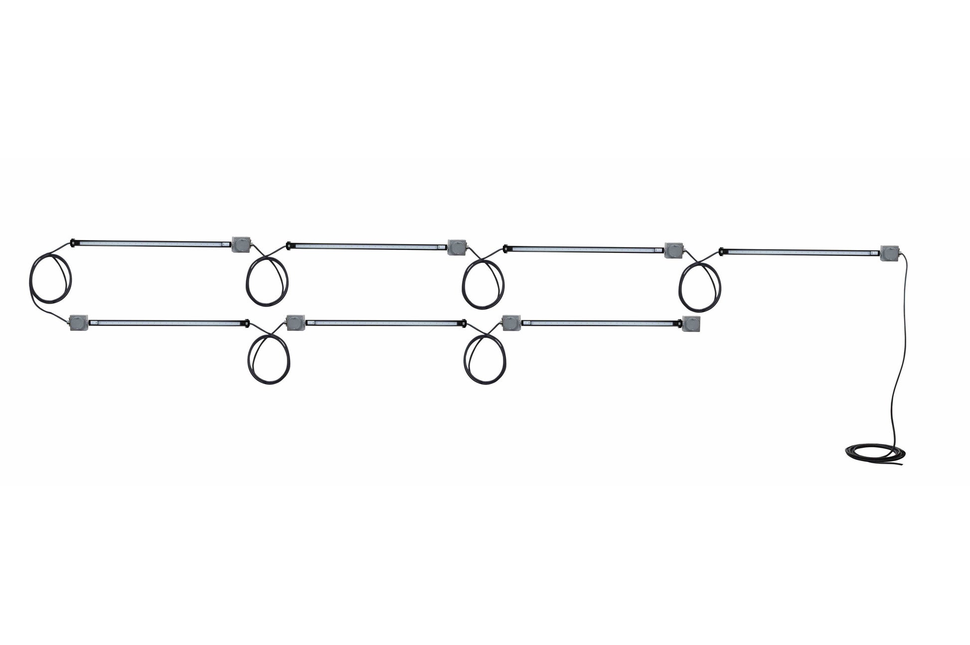 The HAL-SL-7-48IPS-LED-13X-1227-JB6 comes with 13` of 12/3 SOOW line-in cord. Connecting each unit is 13` of 12/3 SOOW cord. Center-to-center spacing measures 17`.
