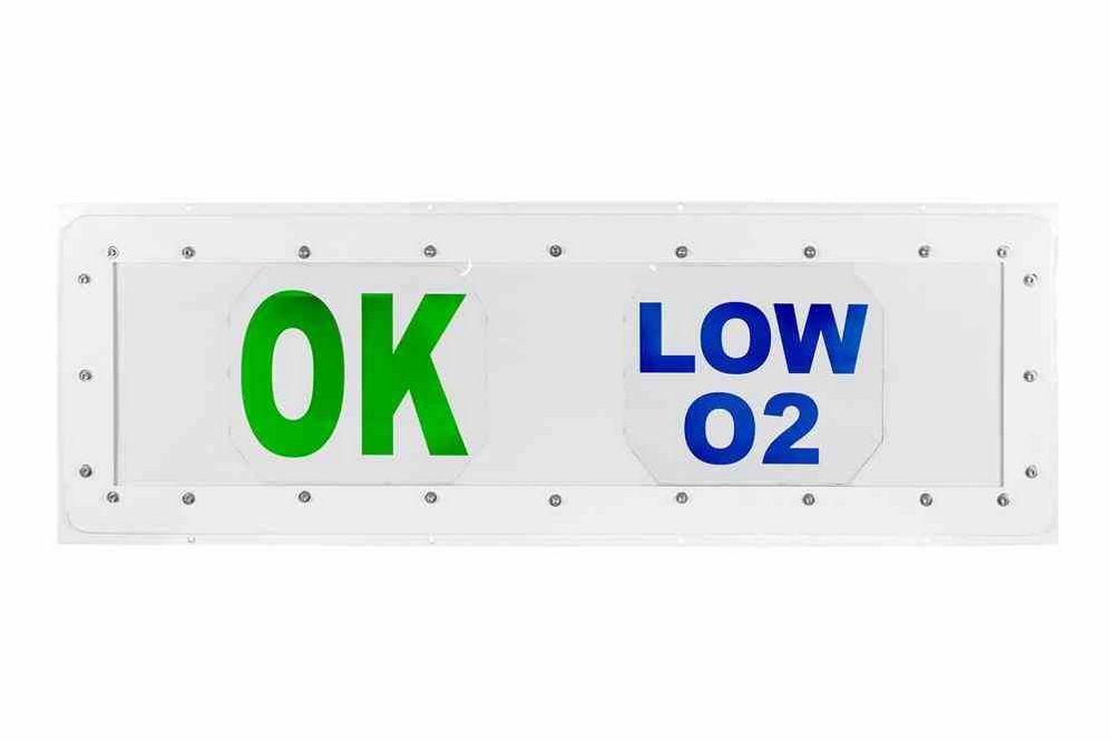 Each sign on the HALD-48-4X12IPS-C-OXM is illuminated by 3,000 lumens of high-intensity LED light which ensures that operators in the vicinity of the light will easily be able to tell if one of the signs is currently lit. Each sign also features a separate control wire for independent on/off control of sign. In the default configuration, the HALD-48-4X12IPS-C-OXM glows green on the left side when the environment is safe or "OK" to be in and glows blue on the right side when low oxygen levels are detected. Custom colors and sign phrases are available upon request for additional applications.