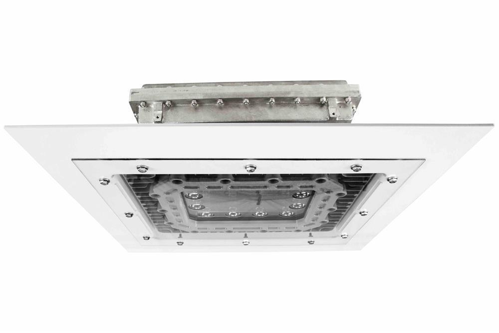 This Class 1 Division 2, Class 2 Division 1 & 2 explosion proof light fixture provides 12,500 lumens of high quality light while drawing only 150 watts. The copper free aluminum alloy body is powder coated for added durability and an attractive aesthetic appearance. A special heat dissipating design in conjunction with LED technology helps this fixture to achieve an excellent 60,000 hour rated lifespan with 80% lumen retention. Light weight and a low profile make this unit an attractive alternative to larger and heavier older fixtures and requires less hardware to install.