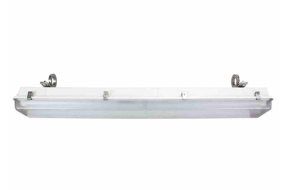 Made in Texas The Larson Electronics HALP-48-2L-SSPM Stainless Steel Hazardous Area Pole Mount Fluorescent Light Fixture is U.S./Canada listed for Class 1 Division 2 Groups A, B, C and D, UL 1598A, T4C temperature rating, and is specifically designed to handle the rigors of wet and corrosive marine environments. This hazardous location light fixture features a pole mounting system and stainless steel hardware for use in corrosive and marine environments. The HALP-48-2L-SSPM hazardous area fluorescent light fixture is designed for use in wet areas and saltwater-marine environments where corrosion resistance is critical to equipment longevity and safety. The HALP-48-2L-SSPM stainless steel pole mount hazardous area LED light fixture is designed for use in wet areas and saltwater-marine environments where corrosion resistance is critical to equipment longevity and safety. This Class 1 Division 2 rated fixture is constructed of non-corrosive materials including a polyester housing reinforced with glass fiber, a poured in gasket for reliable sealing and an impact resistant acrylic diffuser. Eight corrosion resistant stainless steel latches secure the lamp cover to the housing and provide a firm lock against the poured in seal to prevent drips and water intrusion. Two stainless steel bar clamp mounting brackets allow operators to secure the light fixture to existing light poles. The HALP-48-2L-SSPM is UL 844 rated and Class 1 Division II, Groups A, B, C, D approved. This fixture also carries a UL 1598A outdoor marine rating and meets US Coast Guard specifications. This lamp offers the extreme durability and high efficiency in a proven hazardous location fixture design, making it a reliable and affordable lighting solution for open areas where flammable chemicals and vapors may occasionally be present.