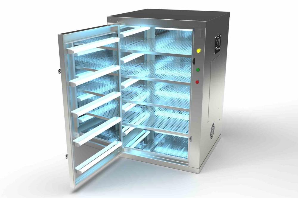 This UV cabinet turns off automatically when the door is open. A yellow indicator light turns on when the unit is in use to safely notify the operator about ongoing sanitation. Adhering closely to exposure times at full capacity, multiple UV cabinets can be purchased to clean several devices and articles of clothing at the same time. Operators may access an external timer on the cabinet to ensure the recommended duration of exposure is met every session. The UV light in this system can disinfect over 99% of bacteria and viruses, as well as kill 99% of viruses, bacteria, mold and spores.