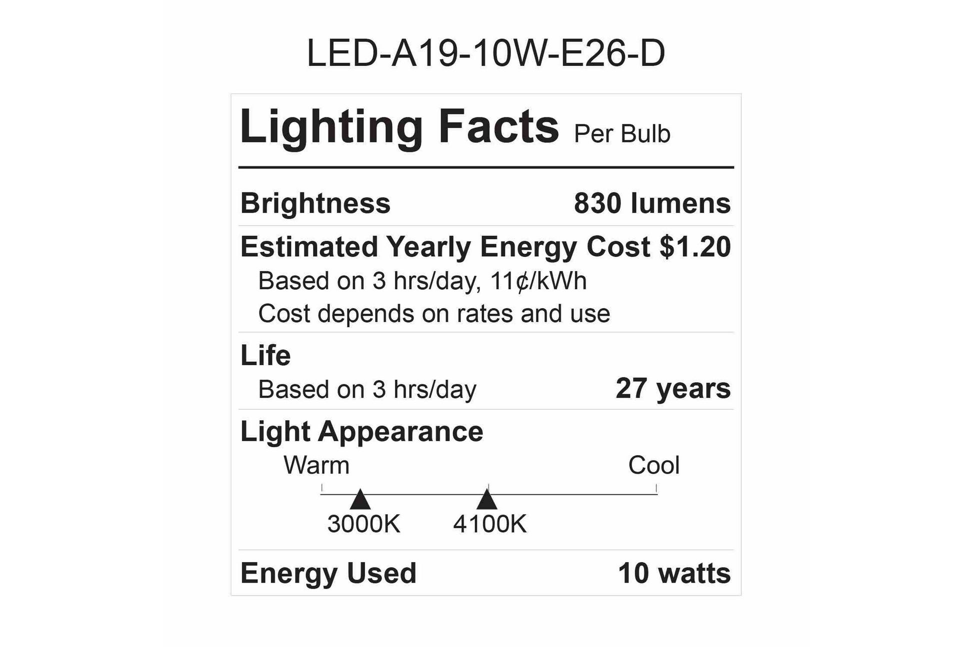 This lamp has an acceptable operating temperature range of -20°C to 45C and an operational life of 25,000 hours. The solid state design of this lamp means it is resistant to the effects of impacts and vibrations, providing added durability to withstand conditions that would cause a normal incandescent bulb to fail. The overall dimensions of the LED light are the same as a standard A19 incandescent lamp, and the base is constructed of aluminum for durability and resistance to rust and corrosion.
