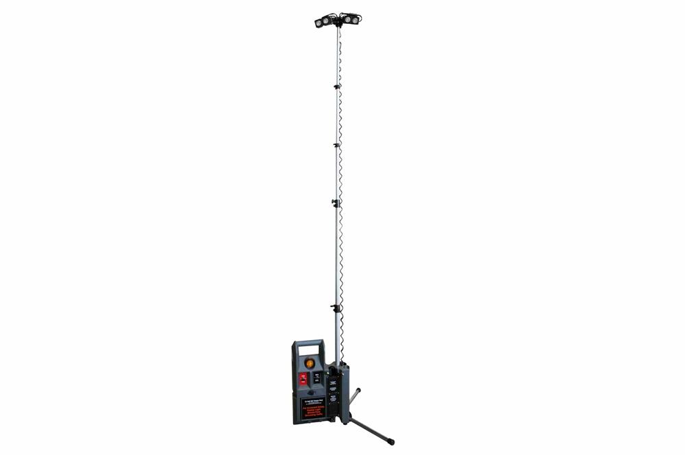 LED Light Bars: This tower includes four 10 watt LED light heads producing a total of 3200 lumens These LED lights are IP68 rated waterproof to three meters and constructed of extruded aluminum with polycarbonate lenses for the ultimate in durability. The LED assembly is mounted to the tower via adjustable mounts which allow operators to adjust the angle and placement of the light heads in any direction. A single retractable cord provides power from the battery to the LED light head. Other configurations are available for higher powered spot and flood beams. For example, this LED light can be configured with our LED10W-6R for 5.5 hours run time and 4800 lumens, while covering an area 400 feet long and 350 feet wide in flood mode (additional costs apply). Contact for special ordering options.