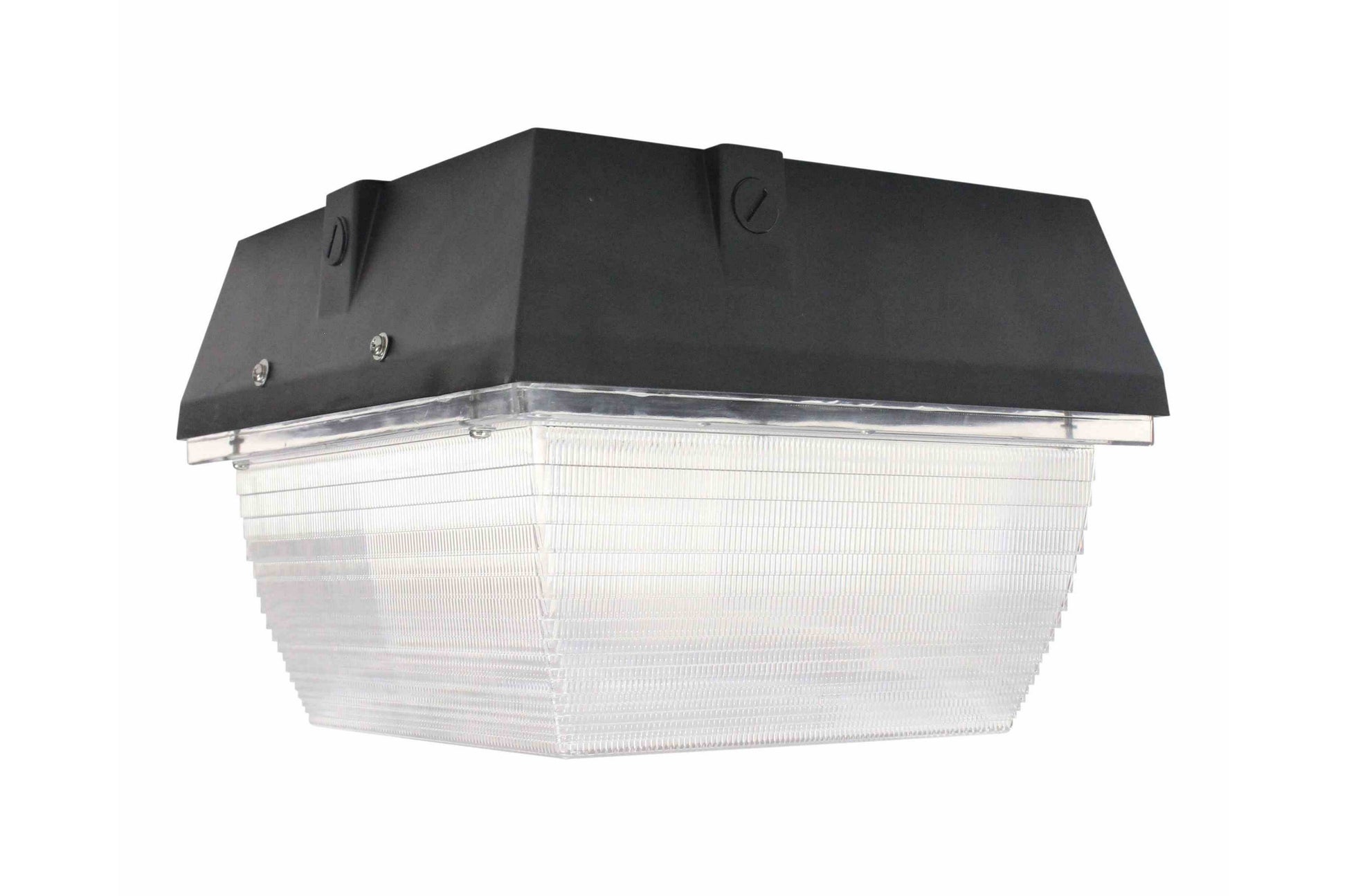 The LEDHCL-450-WCM-3480 consists of an integrated LED assembly housed within a waterproof die cast aluminum housing that is powder coated for added durability and resistance to corrosion. The 2-part housing allows for easy ceiling mount installation and future servicing, and the aluminum design helps heat dissipation and increased LED longevity. The LED lamp assembly is protected by a prismatic polycarbonate lens which is secured to the housing with a one piece injected rubber seal. This prismatic polycarbonate lens is designed for superior light distribution. Four 1/2" NPT knockouts located on three of the sides and back of the fixture provide a secure and sealed power connection point and rounds out this unit`s weather resistant construction. The traditional housing design of this LED canopy light helps maintain building aesthetics when replacing existing canopy lighting.