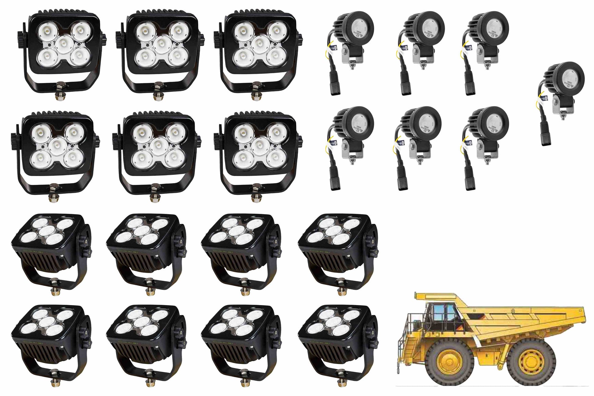 The LLP-CAT-777F LED Light Package comes with 6 LEDP10W-50E-S 4" Square Spot LED Work Lights, 8 LEDP10W-50E-F 4" Square Flood LED Work Lights, and 7 LEDP10W-1R-F 2" Round Flood LED Pod. The