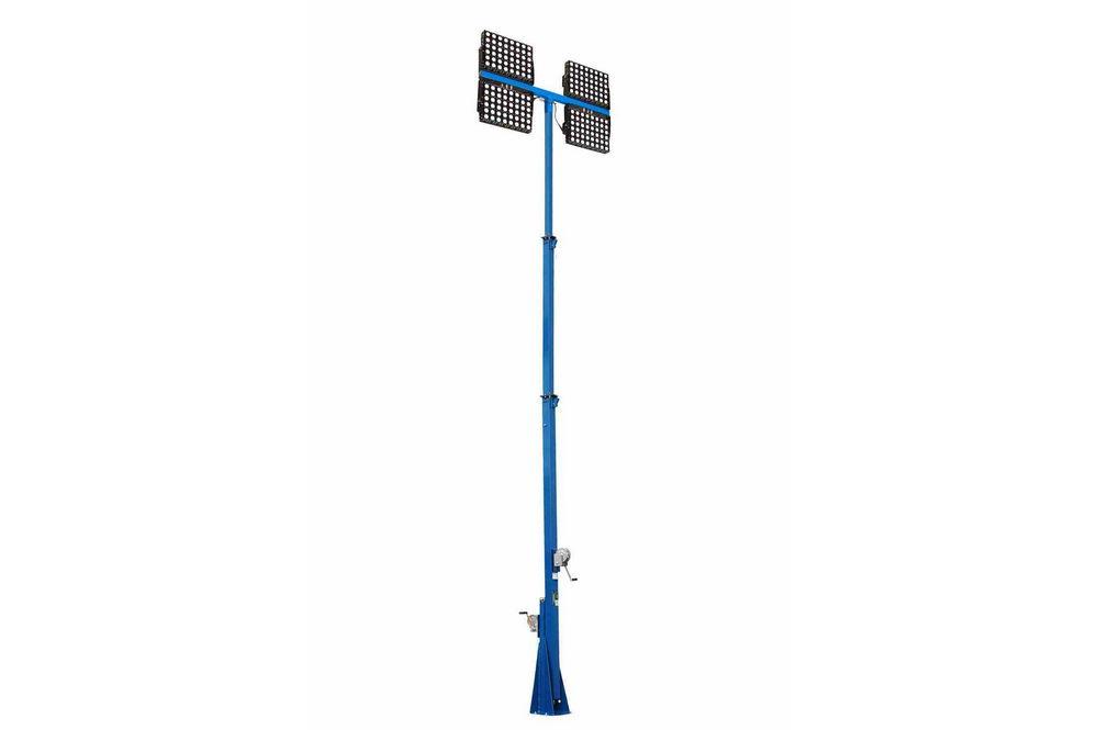 The LM family of telescoping towers feature a proprietary mast guidance system, which provide increased stability during high winds. When lowered to 12 feet, the mast can withstand winds up to 125 mph. When elevated to its full upright position, the mast can be rotated a full 360°. By loosening the T-Handle, operators can rotate the mast with easy in either direction. The mast can be positioned in one of four different directions, and locked back in place by re-tightening the T-handle. The mast itself spins freely with easy, and can typically be rotated with a single hand.  The LM series of towers are powder coated with glossy blue finish for corrosion resistances and aesthetics. These light masts are typically mounted to trailers or other stable surfaces via a 15 inch by 13 inch, 1/4 inch thick mounting base-plate which has been drilled to accept six 5/8" anchor bolts. A 52" long mounting plate constructed of 2" by 2" by 1/4" thick carbon steel is attached to the upper section of the mast which provides a strong and stable platform for the four LED fixtures. This light tower weighs approximately 600 lbs, can easily support and lift 150 lbs fixtures. The entire tower assembly is shipped via common freight carrier and when shipped measures approximately 16.5 feet long, 4 feet wide, 5 feet tall and weighs approximately 1200 lbs. Larson Electronics can custom tailor these units to the customer’s requirements with longer sections and larger mounting plates. We also offer a choice of either the manual 1,000 lbs hand winches included standard or optional electric winches. Suggested Applications: With its easy deployment the LM-30-3S-4X500W-LED is ideal for use in applications that require regular intensive cleaning and are exposed to a lot of vibration, dust, dirt, where abusive working conditions are encountered, temporary lighting, and construction sites.