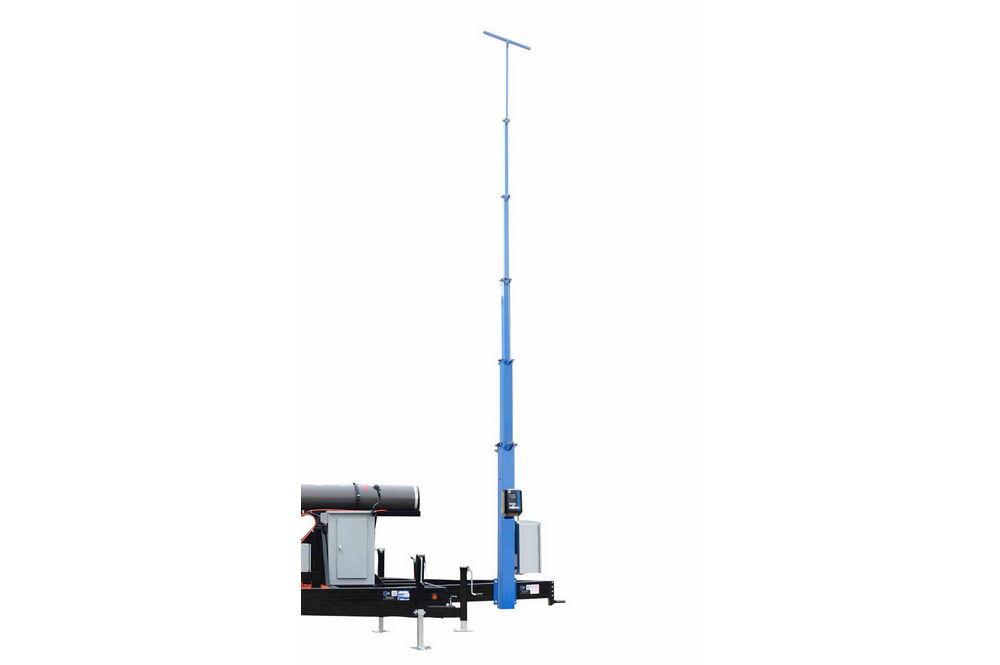 This unit is Made In USA - Manufactured in Texas When your job requires you to get up and go, your equipment needs to do the same without slowing you down. The LM-TM-25-7-6S-FM-EW trailer tongue mounted telescopic mast from Larson Electronics features a 100lb payload and a 2,500lb electric winch. This rugged and reliable 6-stage elevated support system allows operators to quickly and easily deploy temporary lights, security cameras, weather machines/apparatus, and other attachments up to 25` with no need for a power source or special tools. Equipped with a trailer tongue mount, this mast can be collapsed and left mounted for rapid transport. Regardless of the location, the LM-TM-25-7-6S-FM-EW allows you to get in and out of the field without the delay of lugging extra equipment back and forth. Tower: The LM-TM-25-7-6S-FM-EW six-stage telescopic mast is a self-contained and straightforward unit; all parts required for deployment are included with no need for special tools, accessories, or power supply. The LM EW series of light masts from Larson Electronics features an electric winch setup to raise and lower the light mast. A NEMA 3R control box mounted at the base of the light mast houses the controls for power and up and down motions. The electric winch on this mast is offered in 120V or 240V AC 50/60 HZ. Additional voltage options are available at an additional charge. Larson Electronics can offer single phase and three phase AC winches, or low voltage DC winches. The LM series of towers is constructed of heavy duty square steel tubing that is powder coated with a glossy blue finish for a pleasing aesthetic and added corrosion resistance. The base section of this unit measures 46" long, 7"x7" wide, and 3/16" thick; the second section measures 51" long, 6"x6" wide, and 3/16" thick; the third section measures 56" long, 5"x5" wide, and 3/16" thick; the fourth section measures 61" long, 4"x4" wide, and 3/16" thick; the fifth section measures 66" long, 3"x3" wide, and 3/16" thick; the top section measures 71" long, 2"x2" wide and 3/16" thick. Each section has an 11" overlap. A 44" wide and 2" by 2" by 1/4" thick mounting plate is attached to the upper section of the mast which provides a strong and stable platform for light fixtures and other equipment. The LM family of telescoping towers feature a proprietary mast guidance system which provides increased stability during high winds. The mast is extended and lowered using a 2,500lb electric winch with a 3/16" galvanized steel cable. No external power supply is needed for deployment. When lowered to 7`, the mast can withstand winds up to 65 mph, allowing the operator to quickly and easily transport the unit without removing it from the hitch. Alternately, the mast can also be conveniently removed, collapsed, and stowed in the bed of a truck when not in use. Contact for more information.) Mounting: The LM-TM-25-7-6S-FM-EW telescopic mast is mounted using a trailer tongue C channel bracket. The boom on this mast extends up to 25` for maximum area coverage and can be collapsed to down to 7` for operations requiring a smaller coverage area. Applications: Security cameras, temporary lighting, weather machines and apparatuses