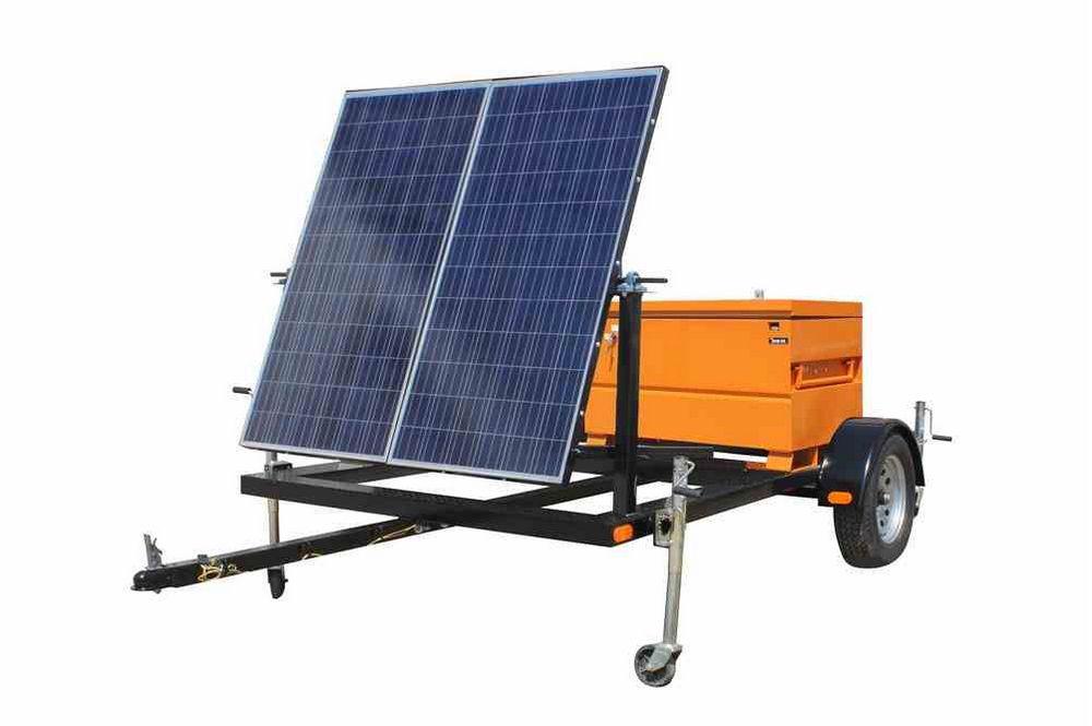 | Made in the USA The Larson Electronics SPG-0.58K-200A-TLR7-120V solar powered generator provides operators with a way to power lights, camera, and other electrical equipment in remote locations where standard 120V line voltage is unavailable. This off-grid generator features two 265 watt solar panels and a 250 amp capacity battery bank. The entire assembly is mounted onto a 7` single axle trailer, allowing operators to transport this solar generator from location to location. *PLEASE NOTE: ANY FREE SHIPPING OFFERS DO NOT APPLY TO LIGHT MASTS OR LIGHT TOWERS* Solar Powered Generator: This solar powered generator includes two solar panels, solar charging system, (2) 8D 250aH 12V battery bank, 300 watt inverter and duplex 5-15P receptacle mounted on trailer with outriggers. This 0.53KW solar generator system replenishes amp hours of usable battery capacity per day, assuming 5.5 hours of peak charging sunlight. This system delivers 120V AC for lighting and electrical equipment in remote locations where standard AC line voltage is not readily available. Solar Panel Assembly: This unit is comprised of two 265-watt solar panels, generating a total maximum output of 0.53 KW. The panels are mounted to a stationary assembly. The panels are wired to the solar charger control box which manages the charging system. The two solar panels are mounted to a frame angled at 45° to capture the intensity of the sun for optimized light intake. A 300 watt DC to AC inverter and a duplex 5-15P receptacle allows operators to power equipment that required 120V AC. Component Control Center: All the electrical components are encapsulated in a NEMA 3R job box that is bolted to the trailer. Since most of these components are not rated for high heat, our component cooling system circulates air within the job box at 1400 CFM when the ambient temperature exceeds 90 degrees Fahrenheit. The job box that contains the component control system includes locks for security purposes. Trailer Assembly: The entire assembly is mounted to a 7` by 7`, single axle trailer via six 1/2" anchor bolts. The two wheel trailer is equipped with 3,500 lbs axle and leaf springs with 15" trailer tires. A standard 2" ball coupling, two standard safety chains, and 7-pin flat trailer plug allow for easy hookup and towing. The trailer tongue can be removed for long term deployment. A rugged and waterproof job box is included, safely secured to the trailer. Four outriggers mounted to the corners of the trailer allow operators to level the trailer, and provide stabilization during deployment. All trailer lighting complies with DOT/FMVSS regulations. |