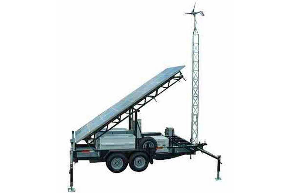 | This solar powered generator consists of a trailer, NEMA 4x rated enclosures, battery power supply, 24 VDC to 120 VAC inverter, solar panels, and supporting gear to feed current from the panels to the batteries. Generator: 24 Kyocera 135W high efficiency multi-crystal photovoltaic (PV) modules, designed in an array of eight module rows and grouped into (2) sixteen panel arrays. These solar panels are pre-wired for 24V operation. Controls: Morningstar 60A, 48V, charge controllers with temperature compensation and LVD. Batteries: UG4-3AVR95-33 Unigy II battery rated at 2151Ah wired for 24VDC. The battery section is vented with stainless steel screen over louvered vents to keep snow, insects, and dust out. Inverter: 5KW, 24VDC input, 120VAC output Exeltech inverter on 19†RU. Trailer: 19ft in length with treated wood floor, electric brakes, a spare tire, and standard pulling hitch. Each trailer is customized to accomodate the solar panel array and battery enclosure with controls and termination points. A set of system tie-downs are included for extra wind loading protection. NEMA 4x Components Enclosure: The SPG3.24KW-19-120 patent pending components enclosure is NEMA 4X rated and features a sealed electronics compartment and includeds a 19.5"H x 24.5"W gold anodized aluminum backplane on one side with a 19" rack on the other side. The solar controllers, DIN rail mounted circuit breakers and terminals for solar, battery, and 120VAC load are mounted on the aluminum backplane, offset from the enclosure wall for heat dissipation. This enclosure is constructed from 1/8" aluminum on the door, wrapped with 3/16" aluminum end caps, and finished with a highly reflective white powder coating which keeps the batteries cooler. Stainless steel hardware with lockable hasp latches and a copper grounding lug are included with the enclosure. A sealed bulkhead keeps gases and moisture from entering the electronics compartment. A Poron memory resistant door gasket is included to seal out water from the battery and electronic compartments. Benefits: No sound. No fumes. No messy or expesive fuel. No thermal footprint. Quick easy setup. Meets Made in America Requirements. Instant Reliable Power. Low maintenance. Options: Milspec connectors. Run Flat Tires. Back up propane generator. Warranty: The SPG3.24KW-19-120 comes with a 5 year warranty. The batteries have a 3 year pro-rated warranty. Each solor powered generator is powered up and tested prior to shipment. |