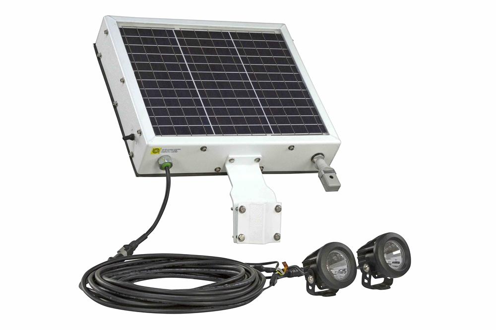 This solar powered LED light is offered in several different configurations and powered by two 8aH sealed lead acid batteries that are recharged by a 30 watt solar panel. Light output comes from a pair of 10 watt LED lamps that each produce 860 lumens. The lamps are connected via a 6" Y cable. This allows operators to mount the lights with them pointing in different directions which increases the area coverage of this unit. The solar panel is configured to operate non-stop 24/7, day/night with photocell, motion sensor for security purposes, on/off switch for manual operation, or flying leads for operators to connect to user provided external switches. The day/night and motion sensor is programmed to active the solar panel in the evening and to shut it off during the day, activating the LED light when ambient lighting falls below 1 lux. The motion sensor will activate the panel upon detecting movement within range of the panel.
