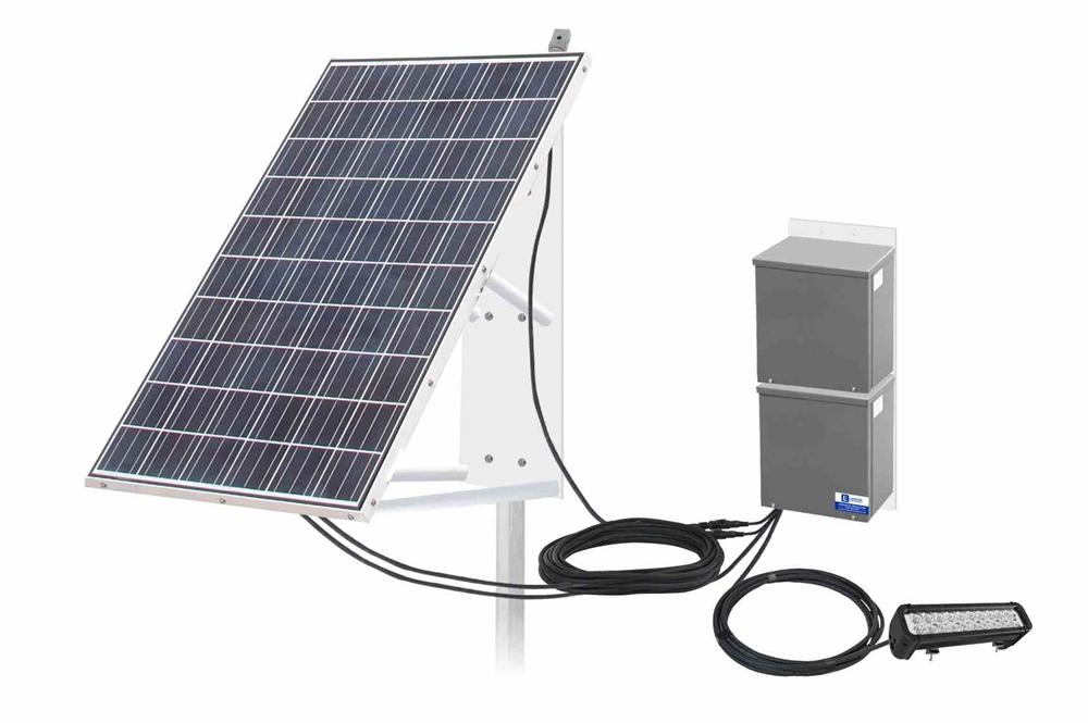 The SPLEDXL-1X20ET is offered in several different configurations and powered by ten, 18aH sealed lead acid batteries that are recharged by a 265-watt solar panel. Light output comes from a 60-watt LED lamp that produces 3,600 lumens with a 6000K color temperature rating. This solar panel is configured to operate non-stop 24/7, day/night with photocell, motion sensor for security purposes, on/off switch for manual operation, or flying leads for operators to connect to user provided external switches. The day/night and motion sensor is programmed to active the solar panel in the evening and to shut it off during the day, activating the LED light when ambient lighting falls below 1 lux. The motion sensor will activate the panel upon detecting movement within range of the panel.