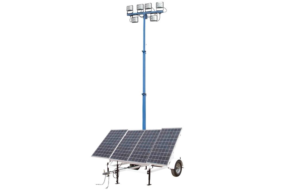 Solar Powered Light Tower: This solar light tower includes four solar panels, solar charging system, battery bank, and manual crank up mast mounted on trailer with outriggers. This 1.06 KW solar generator system replenishes amp hours of usable battery capacity per day, assuming 5.5 hours of peak charging sunlight. This system delivers 24 volts for lighting mounted atop the 30' telescoping light mast.