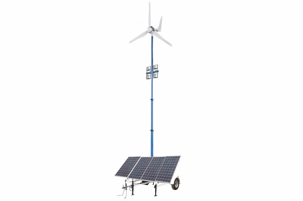 1.2 kW Solar Light Tower - 30' Light Tower, 7.5' Trailer - (4) LED Lamps - (8) 80aH Li-on Batt. - Wind Gen