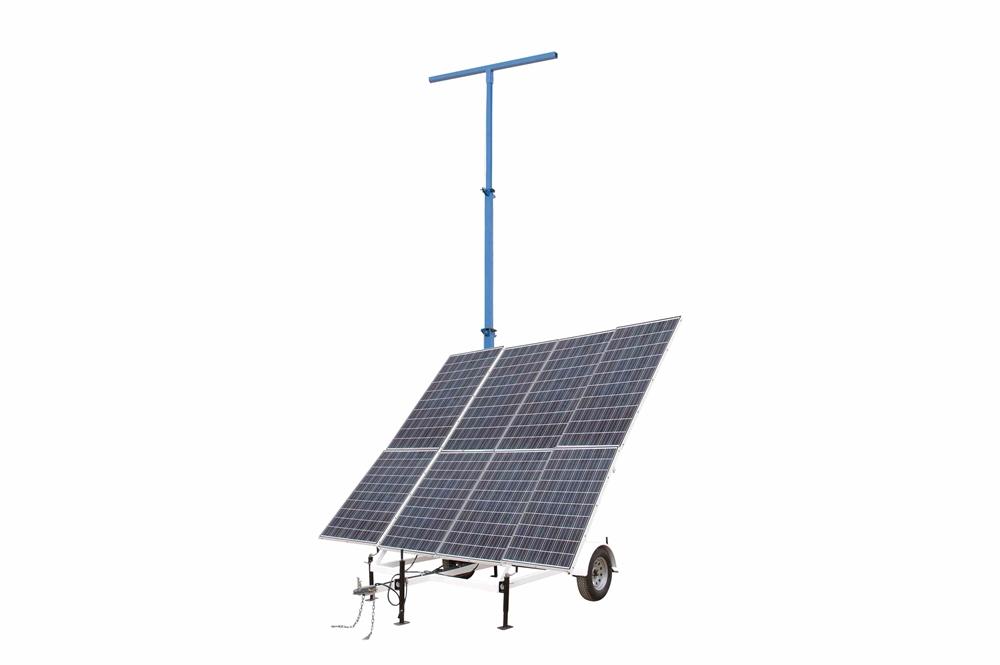 | Solar Panel Assembly: This unit is comprised of eight 300-watt solar panels, generating a total maximum output of 2.4 kW. The panels are mounted securely on a sliding assembly. During deployment, the solar panels slide out in 2 rows of 2 for maximum exposure to sunlight. The panels are wired to the solar charger control box which manages the charging system. When in use, the eight solar panels are angled at 45° to capture the intensity of the sun for optimized light intake. A total of 20, 170aH lithium-ion batteries are available, which can power four 150W fixtures at 120V for 12hrs/day with 4 days of automation (no sun). This system includes a 120V battery charger and an auto-timer for equipment being powered by the unit. Operators may also access a 2,000W 12V to 120V inverter and two solar charge controllers. Component Control Center: All the electrical components are encapsulated in a NEMA 3R job box that is bolted to the trailer. Since most of these components are not rated for high heat, our component cooling system circulates air within the job box at 1400 CFM when the ambient temperature exceeds 90 degrees Fahrenheit. The job box that contains the component control system includes locks for security purposes. Trailer Assembly: The entire assembly is mounted to a 7.5` by 7`, single axle trailer via six 1/2" anchor bolts. The two wheel trailer is equipped with 3,500 lbs axle and leaf springs with 15" trailer tires. A standard 2" ball coupling, two standard safety chains, and 7-pin flat trailer plug allow for easy hookup and towing. The trailer tongue can be removed for long term deployment. A rugged and waterproof job box is included, safely secured to the trailer. Four outriggers mounted to the corners of the trailer allow operators to level the trailer, and provide stabilization during deployment. All trailer lighting complies with DOT/FMVSS regulations. Applications: Remote work locations, construction sites, military bases, camping sites, outdoor events, security applications, emergency services, outdoor lighting, portable lighting and more. |