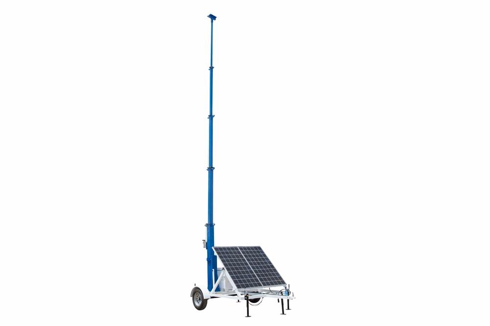 The Larson Electronics SPLT-.6K-LM30-500AH-ISSG-TLR7-100W.DC solar powered LED light tower provides a safe and effective way for operators to quickly deploy cameras, security devices, and other equipment to elevations up to thirty feet. This solar light plant features a telescoping light tower that folds over for easy transportation, a rotating boom that allows for 360° of rotation, and a removable mast head for storage when not in use. The unit contains two 300-watt solar panels and a 500aH capacity battery bank with 250aH being usable and a backup gasoline generator. The entire assembly is mounted onto a 7.5` single axle trailer, allowing operators to transport this portable solar light tower from location to location.