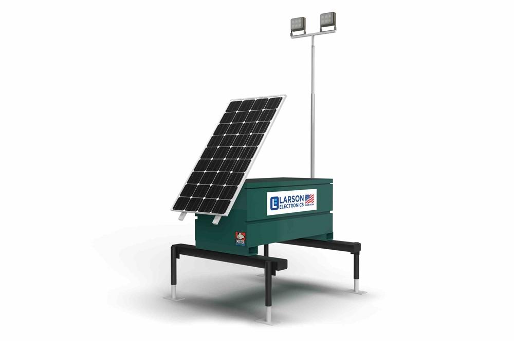 Made in the USA The Larson Electronics SPLT-SMJB-0.3K-LP16-4XWP60-AT-MS-BC-M1 Solar Security Tower provides a safe and effective way for operators to quickly deploy lights to elevations up to sixteen feet in remote areas, construction sites and commercial locations. This solar light plant features a manual push up mast, two LED lights, job box, one 300-watt solar panel and 120aH lithium iron phosphate battery bank. The battery bank will operate for 8+ hours on a fully charged battery bank. *PLEASE NOTE: ANY FREE SHIPPING OFFERS DO NOT APPLY TO LIGHT MASTS OR LIGHT TOWERS* This outdoor security mast enables wide-area monitoring in remote sites, including outdoor areas, construction sites, parking lots, commercial locations, events, roadway projects and more. This system includes a 16-foot manual push up mast, 300-watt solar panel, charge controller, battery bank, two LED lights and lockable job box. The entire assembly is mounted onto a skid platform with four leveling jacks, allowing operators to transport this portable security tower from location to location. During transportation, the LED lights can be stored inside the job box. LED Light Fixtures: This solar light plant is equipped with two, 60-watt high output LED light fixtures. Each unit offers 6,000 lumens during use (12,000 total lumens). The mounting assembly provides rotation and tilt to allow the user to position the unit as desired. These waterproof and vapor proof LED lights are equipped with a motion sensor for automated functionality. Operating modes include: timer, motion sensor and manual light operation. For dark sky compliance, we can add glare shields to the system (at an additional cost). LED Technology: Unlike gas burning and arc type lamps that have glass bulbs, LEDs have no filaments or fragile housings to break during operation. Instead of heating a small filament or using a combination of gases to produce light, light emitting diodes (LEDs) use semi-conductive materials that illuminate when electric current applied and emitting light. With LED lights, there is no warm up time or cool down time before re-striking and provide instant illumination when powered on, adding to the reliability of LED technology. By nature, LED light sources run significantly cooler than traditional lamps, reducing the chance of accidental burns and increased temperatures due to heat emissions. This solid state design of light emitting diodes provides a more reliable, stable, durable, and energy efficient light source over traditional lighting. Light Mast: This three stage steel light mast from Larson Electronics is designed to allow operators to quickly and safely deploy equipment in locations where it must be elevated to heights up to 16` for effective coverage. Once the desired height is reached, the mast can be locked in place. The mast is extended to its full height manually. A 24" mast T-head supports the two LED fixtures at the top of the tower. When elevated to its full upright position, the mast can be rotated a full 360°. By loosening the T-Handle, operators can rotate the mast in either direction. The mast can be positioned in one of four different positions, and locked back in place by re-tightening the T-handle. The mast itself spins freely with easy, and can typically be rotated with a single hand. The LM series of towers are powder coated with glossy blue finish for corrosion resistance and aesthetics. The LM family of telescoping towers feature a proprietary mast guidance system, which provide increased stability during high winds. Four 600 lb hand crank leveling jacks are used for leveling. When lowered to a collapsed position, the mast can withstand winds up to 125 mph. Custom builds can be provided for higher wind speed resistance when fully raised. Solar Panel Assembly: This unit is comprised of one 300-watt solar panel, generating a total maximum output of 0.3 KW. The panel is mounted to the stationary assembly and can be locked at an angle for optimized light intake. The panel is wired to the solar charger control box, which manages the charging system and hosts a charge controller. Operators are provided access to a 120aH lithium iron phosphate battery bank. Component Control Center: All the electrical components are encapsulated in a job box that is bolted to the skid platform The job box that contains the component control system includes locks for security purposes. Skid Mount Assembly: All system components are secured on a heavy-duty skid platform. Operators may pick the unit from the side by positioning forks on sides of wheels. This system can fit in the back of standard pickup truck beds, trailers or inside enclosed trailers, as well as shipping containers. Four 600 lb rated leveling jacks are available for stable deployment. The leveling jacks can be rotated (along with folded solar panels and collapsed mast) for seamless storage.