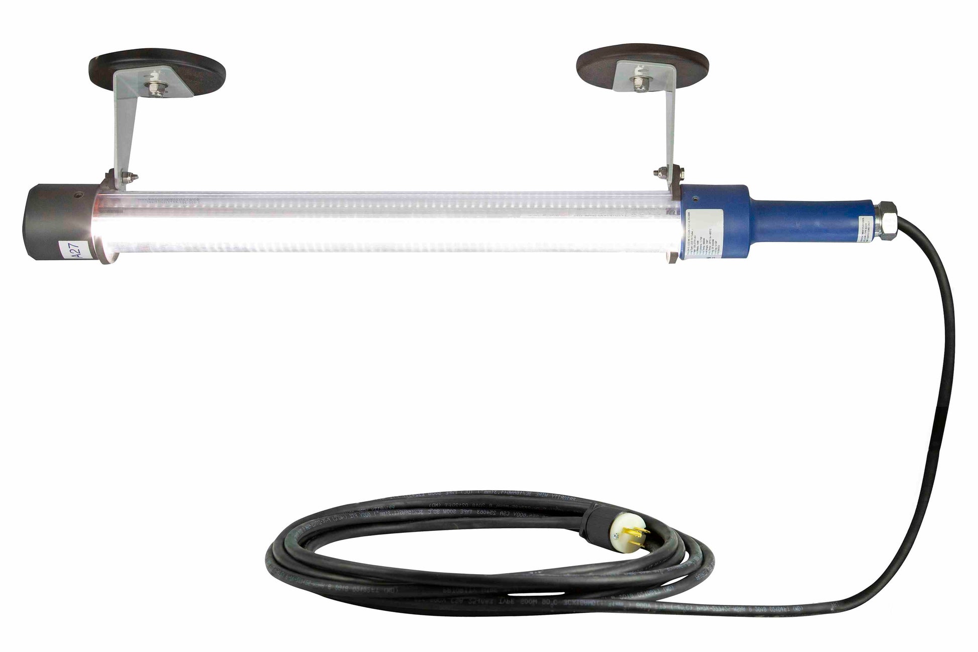 The WAL-24-1L-LED-M-12.3-25 linear portable work light is consists of one 14 watt T8 tube style LED bulb that draws 0.23 amps at 120 volts AC, polycarbonate end caps, and aluminum L brackets with two 100 lb magnets for easy magnetic mounting. Because the T8 tube is a self-contained lighting fixture in itself and requires no additional housing, this unit is ultra compact and low profile. Instead of using a fragile glass bulb as with traditional fluorescent lighting, the housing on this LED fixture is made of impact and shock resistant polycarbonate, making it a much safer and more durable option than fluorescent bulbs. The WAL-24-1L-LED-M-12.3-25 Linear LED Work Light is the ideal replacement for outdated traditional fluorescent fixtures. While fluorescents require additional space for a ballast, contain fragile glass bulbs, and are notorious for annoying flickering and slow start up times, LED T8 tubes require no ballast, take up less space, provide instant full power illumination, and project a stable, no-flicker beam from a durable solid state lighting source.