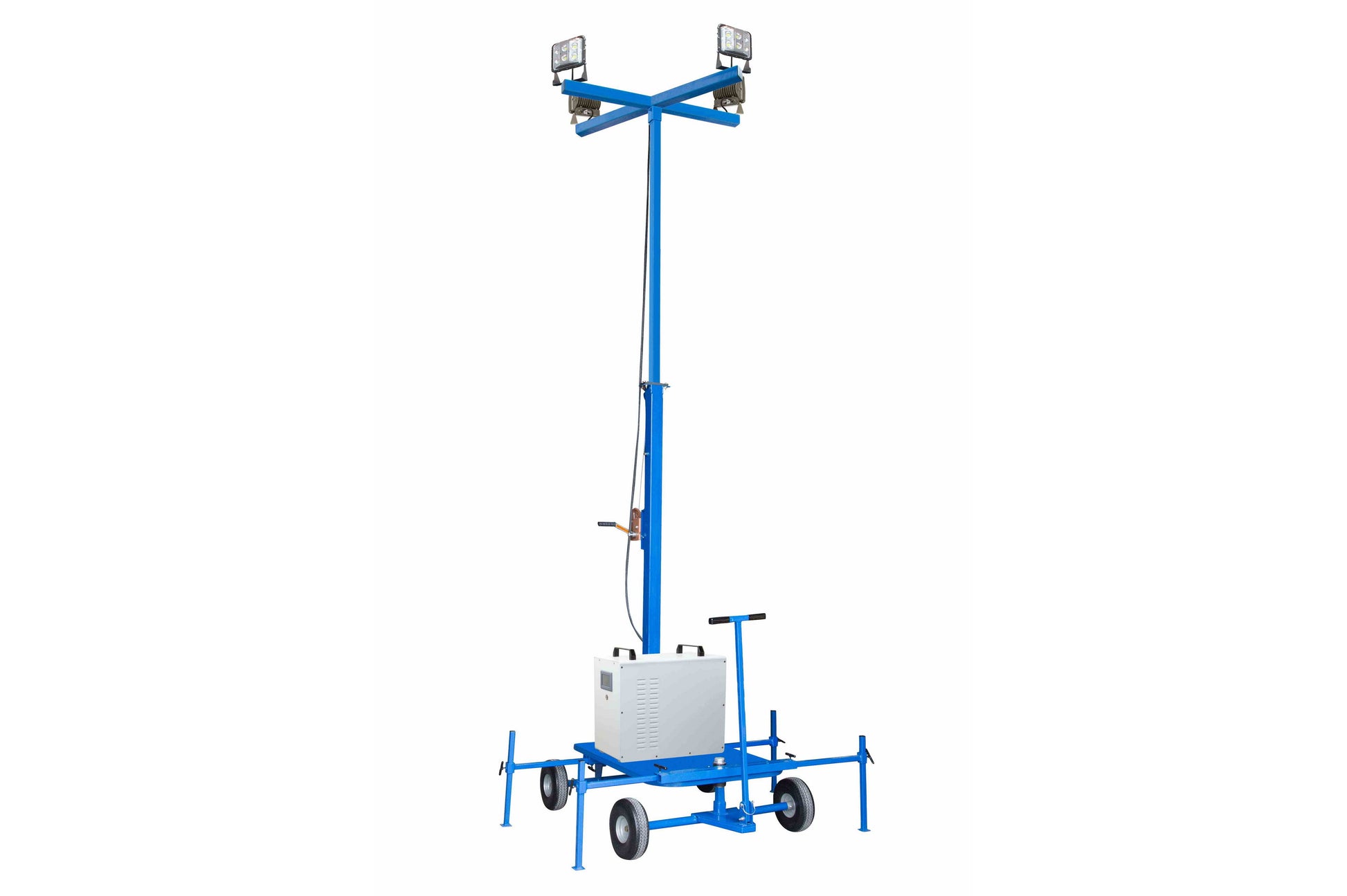The LED light tower is supported by the WAL-ML series pull around cart. This is an extendable tower assembly that can be adjusted from 9 to 13 feet in height for maximum coverage. A single hand crank allows operators to easily raise or lower the tower as needed, and a removable lamp mounting platform allows removal of the lamp assembly for easier transport and storage. The tower is constructed of heavy gauge steel for durability, and a tough powder coat finish provides protection against rust and corrosion. The base of the tower is fitted with four solid wheels to allow easy positioning; the operator can simply roll it into the desired location as needed.
