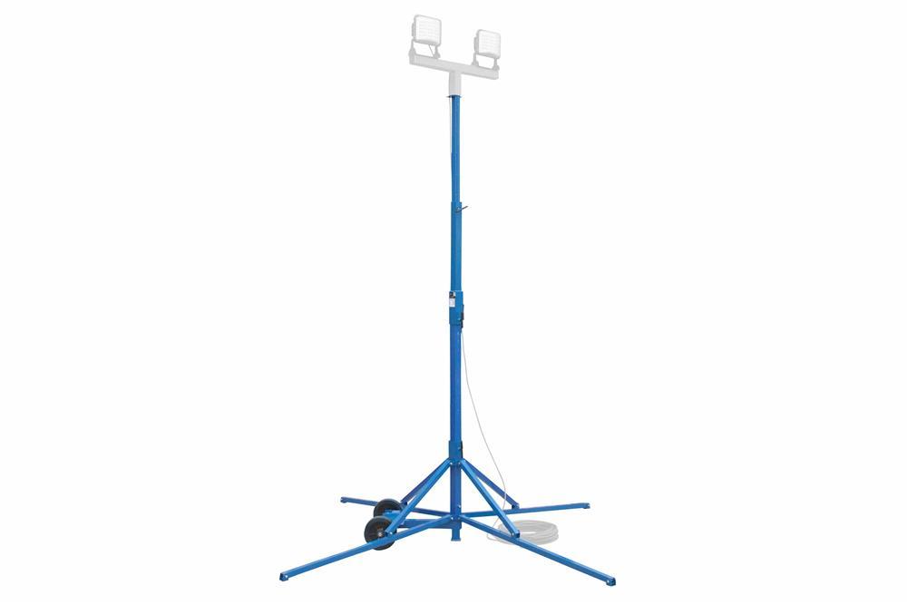 This portable LED light is comprised of two adjustable LED light heads mounted atop a four leg quadpod fabricated from heavy duty steel. This adjustable and collapsible quadpod pod can be extended to twelve feet and collapsed to seven feet, and includes solid wheels to allow the operator to tilt the unit back and simply roll the entire assembly to a new location when fully deployed. The LED light fixtures can be rotated 360° by loosening the trunnion mount, rotating the light to the desired position, and righting the bold. A 180° tilt is available to each lamp by adjusting the set screws located on either side of the lamp and then retightening them to lock the angle in place. The entire assembly can be removed by releasing the hand knob and sliding the light and mounting bracket off of the center support while the legs can be collapsed, aiding in deployment, storage and transport. The lamp can be easily adjusted vertically and locked into position.