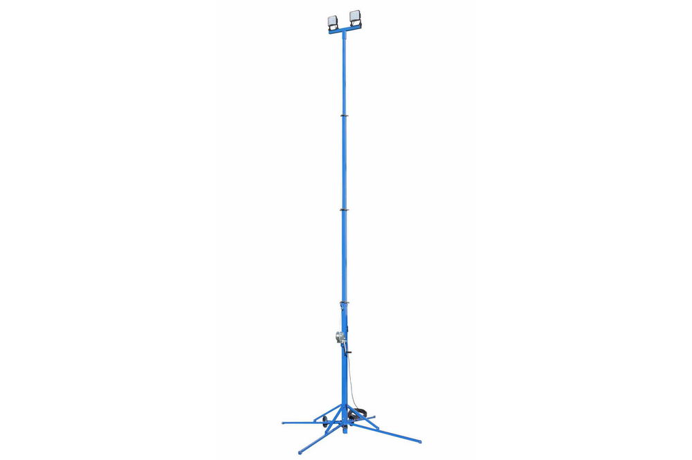 Mounting: This portable quadpod is comprised of a removable LED light assembly fitted with two LED lamps mounted atop a four leg winchpod fabricated from heavy duty steel. This adjustable and collapsible quadpod can be extended to forty feet and collapsed to thirteen feet. Each leg is four feet in length for added support. The unit is extended and lowered using an included hand crank cable winch equipped with a brake for fast and safe deployment. The first stage is 10.54` in length and built from 5" x 5" square steel tubing, the second stage is 10.83` in length and built from 4" x 4" square steel tubing, the third stage is 11.13` in length and built from 3" x 3" square steel tubing with the top stage measuring 11.54` in length and built from 2" x 2" square steel tubing. Included solid wheels allow the operator to tilt the unit back and simply roll the entire assembly to a new location when fully deployed. The light fixture assembly can be removed by releasing the hand knob and sliding the lights and mounting bracket off of the center support while the legs can be collapsed, aiding in deployment, storage and transport. The lamps can be easily adjusted up, down or from side to side independently of each other and locked into position for maximum coverage of the work area.