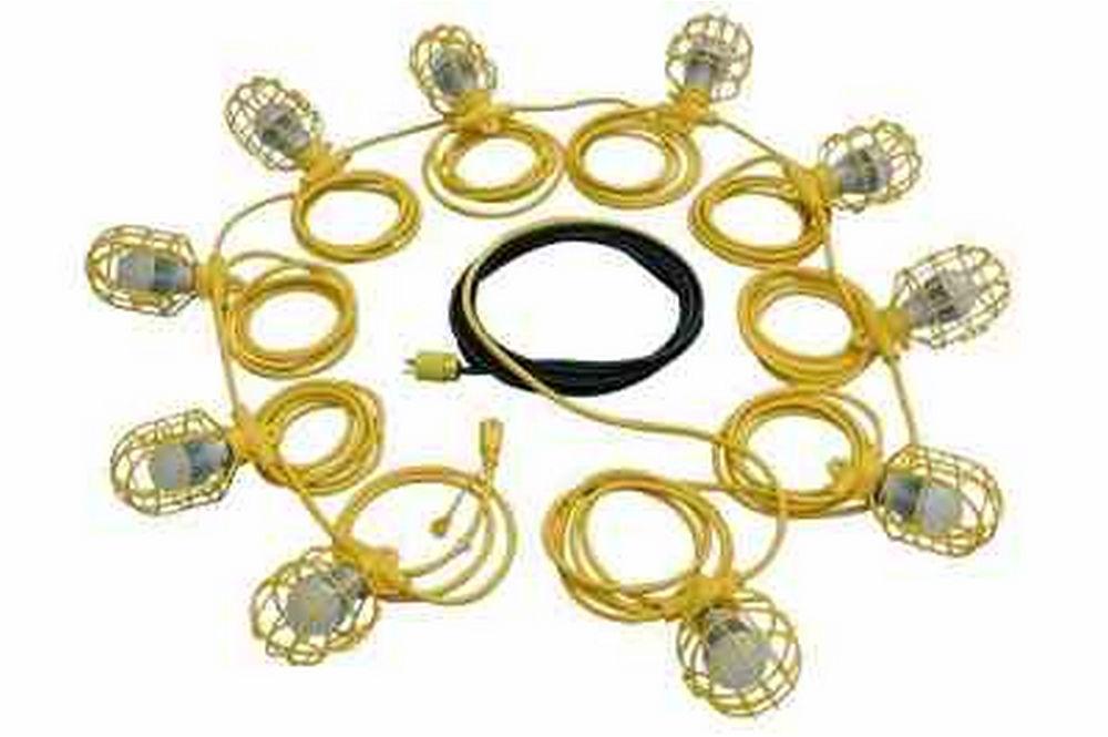 This temporary tunnel string light consists of 530 industrial grade LED lamps with 10` of 12/3 SJTW cable between each unit, stretching a total of 5700` in length. This temporary LED string light is connected to a 277V power source via an integrated 4.5` cable terminated with in a NEMA L7-15P cord cap. Each globe light is equipped with a high output LED bulb which delivers more light output than a 100 watt incandescent. The 10 watt LED bulb draws 10% the electrical power of a standard 100 watt bulb, making it suitable for standard voltage and low voltage applications. Each LED light screws into a molded E26 lamp socket and the bulb is enclosed in a bird cage style metal guard.