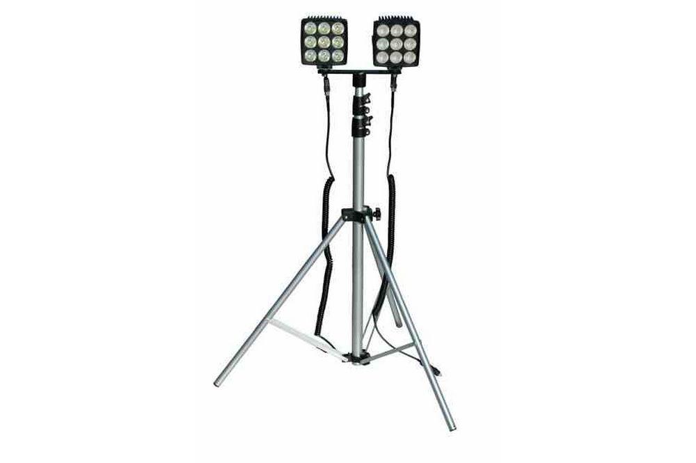 | Durability: The WALTP-2X90-BC Tripod Mounted Dual LED Light incorporates two IP68 rated LED light emitters on a collapsible aluminum tripod. These weatherproof LED lights have a durable powder coat finish, are IP68 rated waterproof to 3 meters, sealed against intrusion by dust and dirt, and very ruggedly constructed to withstand the most demanding environments, conditions and applications. The tripod weighs 8 pounds and the 2 light heads and attachment bracket weigh 12 pounds. The adjustable tripod is constructed of heavy duty aluminum and provides secure height adjustment, leg positioning, and light mounting that will hold position even in windy conditions. Mounting: The LED light heads on this unit are mounted to a single removable bracket that allows the user to simply remove the entire light assembly from the tripod for easy stowing and transport. Each LED light can be adjusted independently of the other to provide maximum coverage or maximum intensity. Together, the LED lights can cover an area 3000`L x 175`W in spot mode and 1800`L x 375`W in flood mode. Power: These LED tower lights are equipped with a 16 foot cord and battery clamps. You do not need to anything special to operate these light bars in their multi-voltage 9-32 Volt configuration. They will sense the incoming voltage and adapt accordingly. Versatility: The easy deployment and multi-voltage capability of this light tower makes it ideal for rapid deployment as a scene light for first responders to downed lines, main breaks or accidents. Hunters will find value in this LED light configuration for feeder light applications. Other applications include temporary maintenance operations, tank cleaning, power washing and other maintenance applications where general area lighting is not available. Temporary event organizers will find value in these telescoping LED lights for general area lighting in outdoor arenas where temporary power distribution is unavailable or expensive. Unlike our larger metal halide towers, these LED lights can be positioned next to the users. While our larger WAL-C-2XM 2000 watt metal halide lights on telescoping tripods cover more area, they are typically paired with large portable electrical distribution panels, transformers or diesel generators. The noise, fumes and high wattage electrical cabling usually requires that the operator positions the portable light tower at some distance from the work area or event. While these LED light towers produce less light coverage than the large metal halide lights, they can be placed right next to the work area, event or operators, so the overall effective illumination will be greater. |