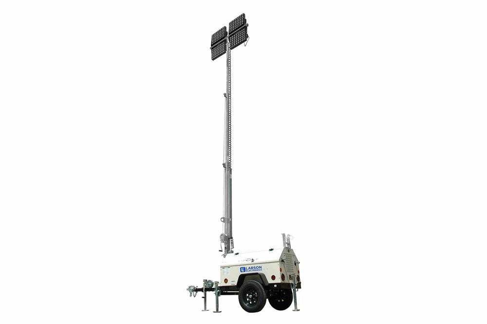 | Made in Texas The WCDE-6-45-4X500LTL-M3 mobile light tower from Larson Electronics is a towable lighting package powered by a water cooled diesel engine turning a single bearing 4 pole generator which produces 8,000 watts and single-phase 120/240V @ 60Hz. The five-stage mast is capable of extending to 45 feet and collapsing to 9 feet. With four LED lamps producing 259,200 lumens, this unit will illuminate a 5-7 acre area continuously without refueling for 6-7 days via a 45-gallon fuel tank. All lights are sealed for protection from moisture, rain, dust and rough weather conditions. The WCDE-6-45-4X500LTL-M3 mobile light tower is a self contained towable five-stage light tower package that produces enough light to illuminate an area up to 7 acres in size. This unit contains a water cooled diesel engine powering an 8,000 watt generator, which supplies the current to four LED lamps producing 64,800 lumens each for a combined total of 259,200 lumens of light. This unit can run uninterrupted for 6-7 days straight (continuous duty) without refueling on a single tank of fuel and includes a telescoping light mast which can elevate the four LED lamps to a height of 45 feet. The system is designed for operation in rainy, dusty, windy and rugged environments. This mobile floodlight package is ideal for emergency services, large scale event illumination, construction, mining, industrial operations and anywhere an extended operation capable mobile lighting solution is needed. The WCDE-6-45-4X500LTL-M3 mobile light tower incorporates a long list of impressive features. The diesel engine is a water cooled Kubota that operates at 3600 RPM. This engine with a tier 4 exhaust features key operated electric starting, a full twelve volt electrical system, automatic low oil pressure and high temperature safety shutoffs, dual fuel filters and easy access oil and radiator drain ports to facilitate maintenance. A 45-gallon fuel tank allows the engine to operate for 6-7 days continuously without refueling. The 8,000 watt generator is a single bearing design and produces single-phase 120/240 volt current at 60Hz. The generator uses a four wire hookup system with an external ground allowing for setting up both electrical and mechanical safe grounding systems. Noise level is 71 dbA at 23 feet (7m). Lights: The lighting system on this unit is comprised of four 480-watt LED lamps producing 64,800 lumens of light each attached to the end of the telescoping light boom. These floodlights produce a wide flood light pattern capable of illuminating 7 acres with a combined total of 259,200 lumens of light. Forty-Eight CREE® high output LEDs producing 1,350 lumens each are arranged in rows and paired with PMMA high purity optics to produce a well focused 24° wide spot beam that is ideal for providing far reaching concentrated illumination while still covering a substantial amount of area. We also offer optional optics with 10° spot, 38° narrow flood, 60° flood, and 90° wide flood beam spreads. The spot beams are tightly focused and are designed for high elevation mounting to achieve distance, making spot versions ideal for high mast and spots lighting. The flood beams are designed to provide more light over a larger area nearer the fixture, making flood versions ideal for use as dedicated work and area lights. Heat Management: Heat is the single largest factor in premature LED failure and color shifting. These LED units feature individual heat sinks per bank of six LEDs to control heat buildup rather than utilizing a single housing to dissipate heat. This allows for more thorough cooling of the LEDs for extended operating periods. This allows the LEDs to be driven at up to 90% capacity without overheating or visible loss of light output. The end result is more light with less heat and longer LED life with an average 70% lumen maintenance after 80,000 hours. Durability: As well as unparalleled heat control, the LED lights also offer IP67 rated construction that is designed to withstand extremes of environmental and operating conditions. These units can withstand rapid temperature changes of -40° Celsius to +80° Celsius, are waterproof, and resist ingress of dust, dirt and humidity. The housings are formed from die cast aluminum and the optics are high transmission PMMA with 98% light transmittance. The CREE® LEDs help these units achieve resistance to vibrations and are rated at 70% lumen maintenance after 80,000 hours of use. We recommend these LED lights for use in applications where a lot of vibration, dust, dirt, dampness and abusive working conditions are encountered. Controls: The operations system for this unit is a centrally located control panel within the light tower enclosure. Four circuit breaker protected switches allow individual control of the lights while an individual hour meter tracks unit operating time. Also included is an alternator warning light, fuel primer system, preheating switch, 120 volt GFCI duplex receptacle for auxiliary power takeoff and a 240V twist lock power receptacle. Telescoping Boom: The telescoping boom consists of five sections extending up to 45 feet (and collapses to 9 feet) through the use of two manual self braking winches and allows for rotating the lights 360 degrees. This winch is mounted to the trailer tongue and acts to raise the tower into a vertical position while the other is mounted to the boom and is used to extend the tower to the desired height. An accessible bracket is available for mounting a license plate with the lighting system. The telescoping boom is constructed of aluminum and is capable of withstanding 50 mph winds when extended to its full height and the stabilizing outriggers are deployed. The stabilizing outriggers are a three point design with one located under the trailer tongue and two on the rear sides of the unit. The two side outriggers are adjustable and include 3,000 lbs swivel jacks for leveling and stabilizing the tower. Housing: All of t