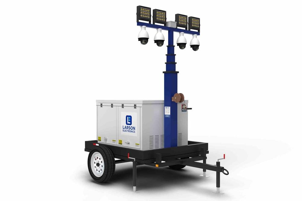 The WCDE-6K-40FT-4X2MP-PTZ-4X150LTL-LED-2TB-AP-W4G Telescoping Mobile Security Tower from Larson Electronics is a fully standalone security surveillance package with remote monitoring, powered by a water cooled diesel engine turning a single bearing 6,000 watt generator. There are four, PTZ day/night IP cameras mounted at the top of the five-stage mast, supported by a 2TB NVR at the base of the tower, four LED flood lights producing 81,000 lumens of intense light, an unlocked professional grade router with an external antenna and wireless access point. Protected by a heavy-duty trailer with metal enclosure, the entire system can run continuously for 120+ hours on a full tank of fuel.
