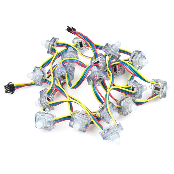 Let there be light(s)! This festive string of addressable RGB LEDs can add color to indoor or outdoor displays. Much like our addressable LED strips, this chain of lights is composed of 20 individually sealed 10mm RGB LEDs and drivers. The driver for this chain is our old friend, the WS-2801 constant current LED driver. The WS2801 is a common, well-supported driver and example code is available for various microcontrollers. The 2-wire control scheme allows you to control the entire chain over only two GPIOs and because data cascades across the drivers, you can chain as many of these together as you can power!