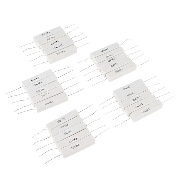 Holy Wattage, Batman! This Power Resistor Kit comes with 5 each of 5 different 10 Watt resistor values including 1 Ohm, 2 Ohm, 4 Ohm, 8 Ohm, and 16 Ohm. These resistors are capable of dissipating large amounts of power without damaging themselves. This kit is perfect for testing projects that require large amounts of power while only requiring low resistance.