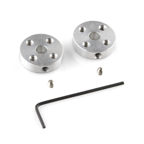 The universal aluminum mounting hub allows you to mount custom wheels and mechanisms to 5 mm motor shafts. The hubs are sold in pairs. The set includes one Allen wrench and two 4-40 set screws for securing the hubs to motor shafts.