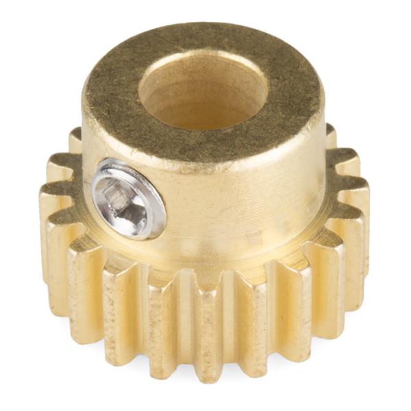These pinion gears attach to a ¼ D-shaft or gear motor using a setscrew. They have 20 teeth with a gear pitch of 32P, an outer diameter of 0.688, and a bore of 0.25.