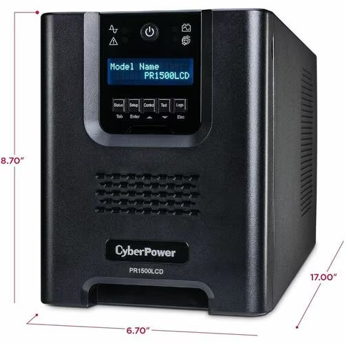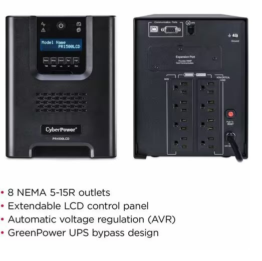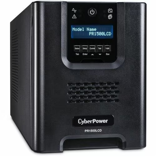 A mini-tower UPS with line interactive topology, the CyberPower Smart App Sinewave PR1500LCD provides battery backup, power protection (using sine wave output), and surge protection for corporate servers, department servers, storage appliances, network devices, and telecom installations requiring Active PFC power source compatibility. The PR1500LCD uses Automatic Voltage Regulation (AVR) to correct minor power fluctuations without switching to battery power, which extends battery life. AVR is essential in areas where power fluctuations occur frequently. The PR1500LCD comes with a three-year warranty and a $375,000 Connected Equipment Guarantee.