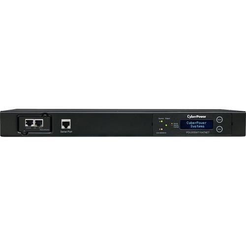 The CyberPower PDU20SWT10ATNET, 10-outlet 1U rack mount switched auto transfer switch (ATS) PDU, provides 100-120V / 20A output. The PDU distributes power to 10 NEMA 5-20R receptacles from redundant NEMA L5-20P plugs. Dual power cords can be plugged into separate power sources to provide redundancy to single-corded equipment. If there is a power failure or an under/over voltage, the PDU will switch to the secondary power source to insure continuous operation.