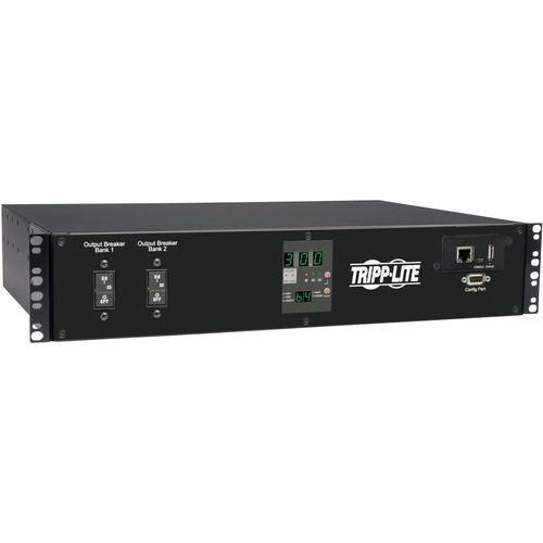 Tripp Lite Switched ATS / Auto Transfer Switch provides a redundant power option for single-corded network devices. Dual input cords support separate connection to PRIMARY and SECONDARY power sources. The ATS will normally maintain continuous output to all outlets as derived from the primary input cable. If the primary power source becomes unstable or fails altogether, the ATS will switch over to the secondary power source until the primary input is restored and stable. Highly reliable solid-state switching between primary and secondary inputs occurs in 1-5 milliseconds. Switched PDU features include individually controllable output receptacles and built-in network interface. Super-fast switchover between primary and secondary power sources occurs within milliseconds. ATS functionality is supported by any two compatible AC power sources, regardless of phase angle, to support a variety of advanced redundant power networking applications. Enables fault tolerant hot-swappable UPS protection when used with a single UPS and fully redundant UPS protection when each cord is connected to a separate UPS system. In a two-UPS environment, the primary input cable must be supported by a full time sine wave UPS with zero transfer time. Tripp Lite SmartOnline series is highly recommended for use as the primary UPS in a two-UPS application. ATS configurations utilizing separate mains circuits, backup generators and even separate utility power grid feeds are fully supported. On-board ATS processor constantly evaluates power quality on both input sources to prevent transfer to the secondary source when unavailable or of lower quality than the primary source. Front input LED's display primary or secondary power availability. Built-in LX Platform network management interface card. The Java-free LX Platform HTML5-based network interface enables full remote access for PDU status monitoring and email notifications via secure web browser, SNMP, telnet or SSH. It supports 10/100 Mbps auto-sensing for optimum communication with an Ethernet network. Optional EnviroSense2 modules (sold separately) provide a variety of environmental monitoring capabilities. Protocols supported include HTTP, HTTPS, SMTP, SNMPv1, SNMPv2, SNMPv3, telnet, SSH, FTP, DHCP and NTP.