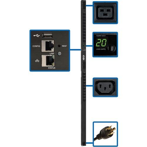 The PDUMV20HVNETLX 3.2-3.8kW Single-Phase Switched PDU provides advanced network control and remote power monitoring with the ability to turn on, turn off, reboot or lock out power to each outlet. Recommended for any IT or industrial application, it features 24 switched outlets (20 C13 and 4 C19) with included plug-lock insert sleeves to prevent cables from becoming accidentally disconnected. A 10-foot cord with NEMA L6-20P plug connects the PDU's C20 inlet to a compatible AC power source, generator or protected UPS.The built-in Java-free HTML5-based LX Platform network interface enables full remote access for PDU status monitoring and email notifications via secure web browser, SNMP, telnet or SSH. It supports 10/100 Mbps auto-sensing for optimum communication with an Ethernet network. Optional EnviroSense2 modules (sold separately) provide a variety of environmental monitoring capabilities. Protocols supported include HTTP, HTTPS, SMTP, SNMPv1, SNMPv2, SNMPv3, telnet, SSH, FTP, DHCP and NTP.