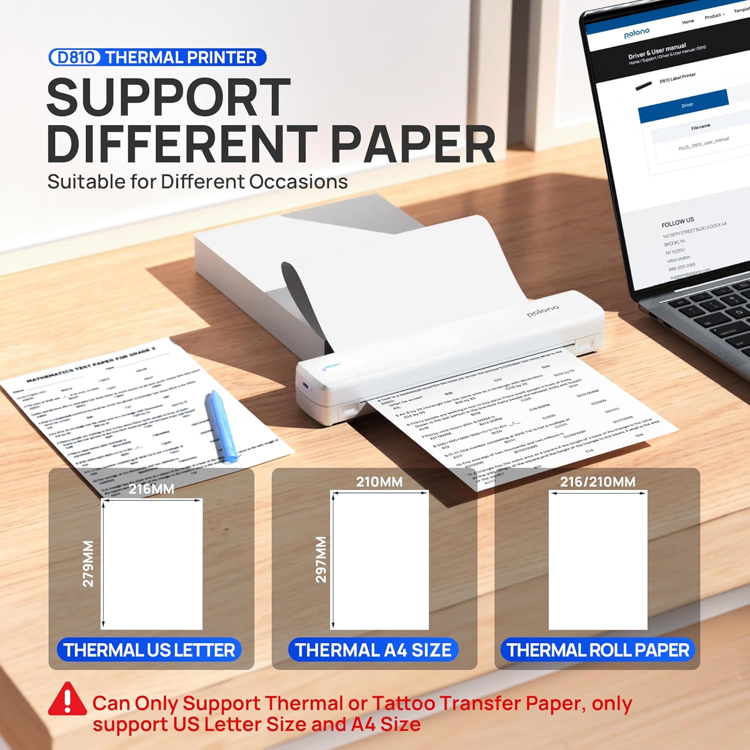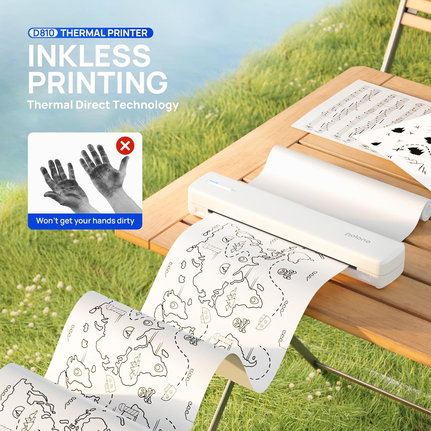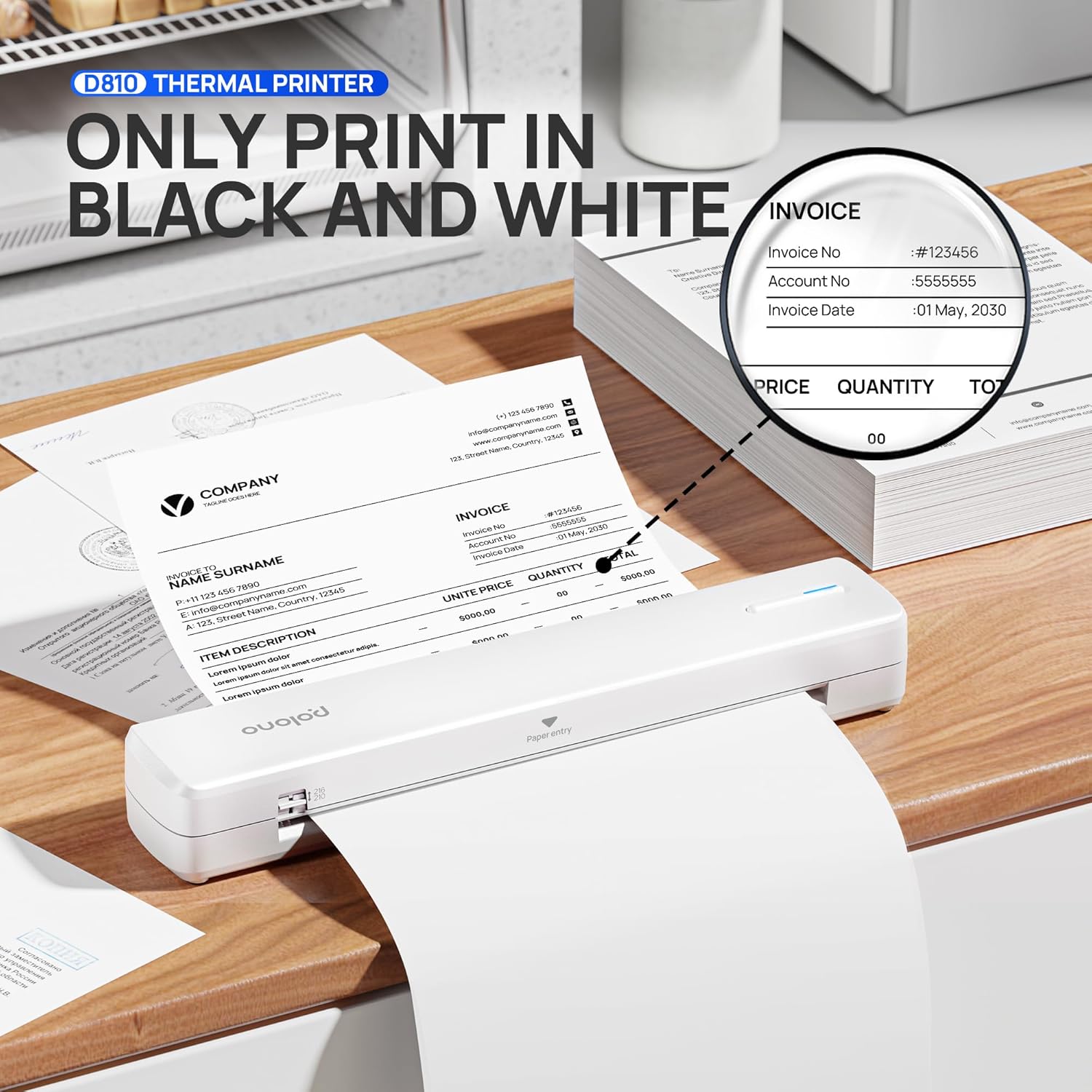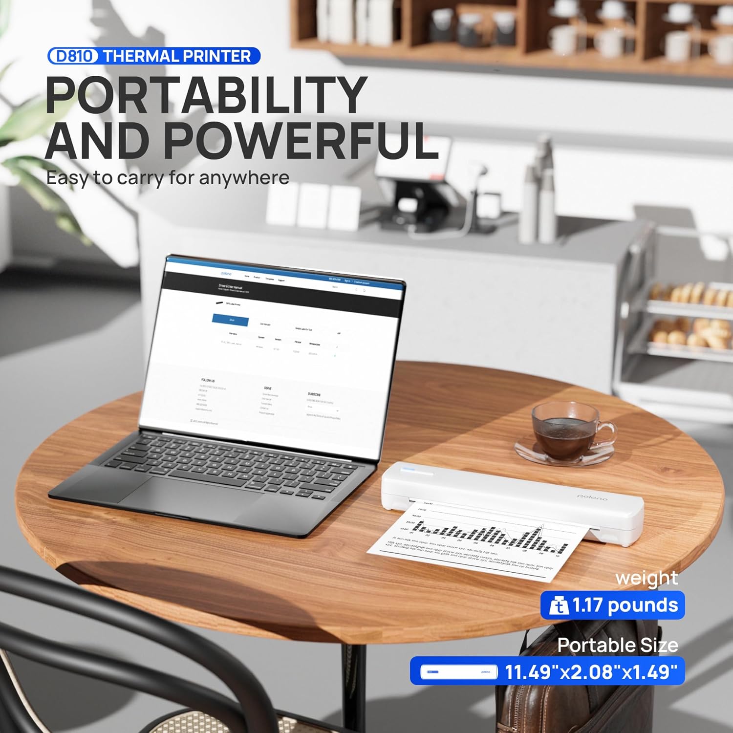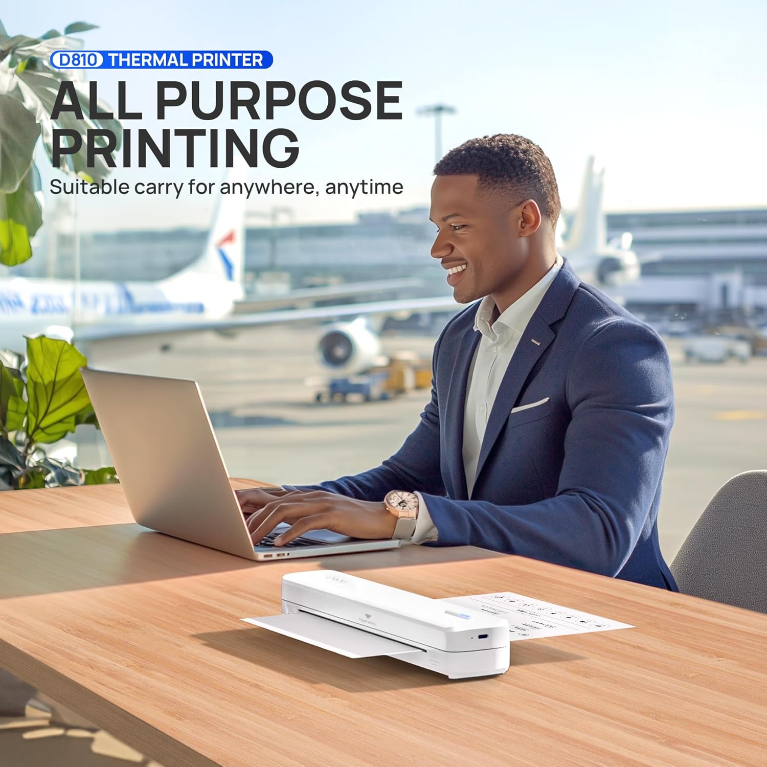 POLONO Portable Printer Wireless for Travel, D810 Bluetooth Thermal Printer Support for 8.5"x11" US Letter, Inkless Compatible with iOS, Android, Laptop for Office, Car and Home, White