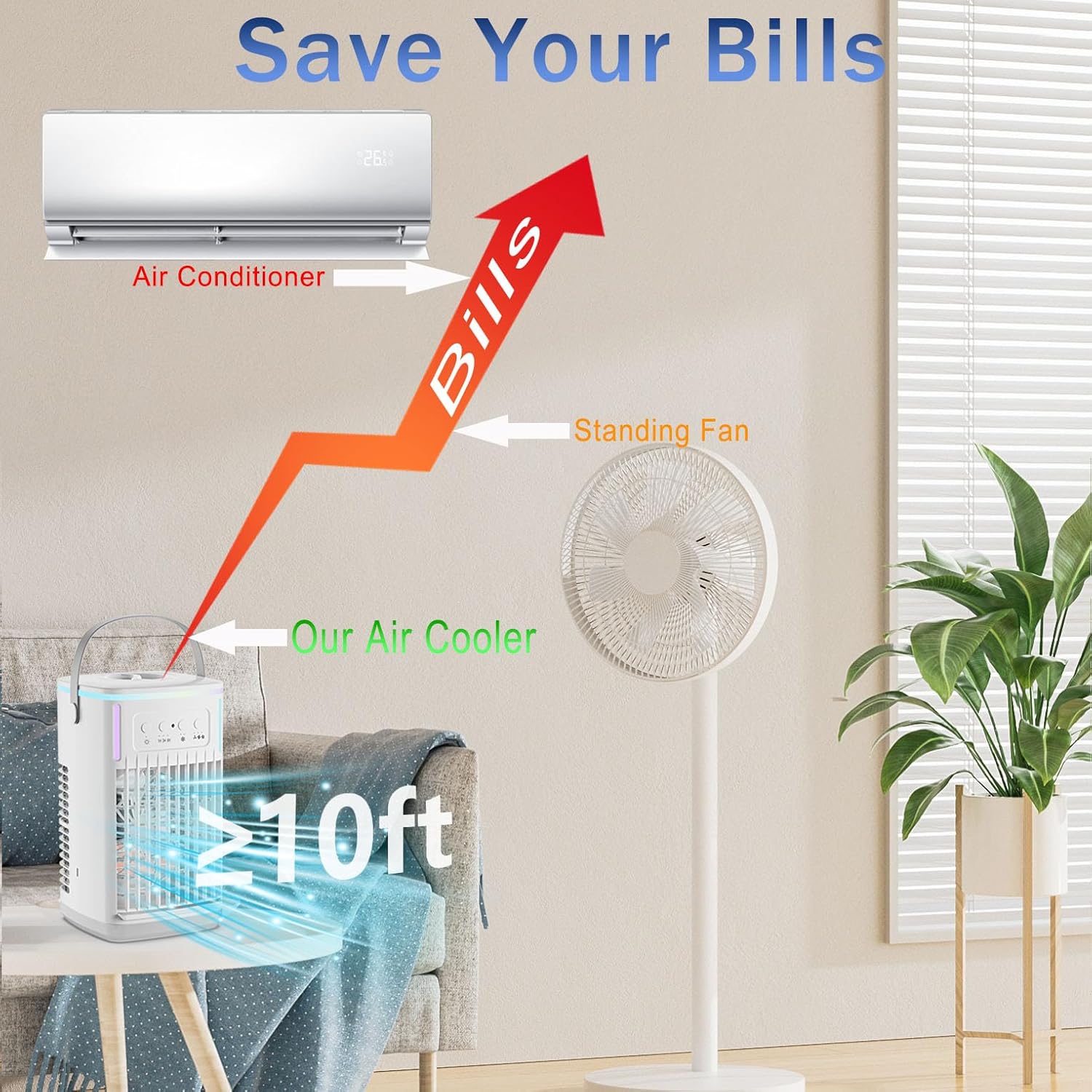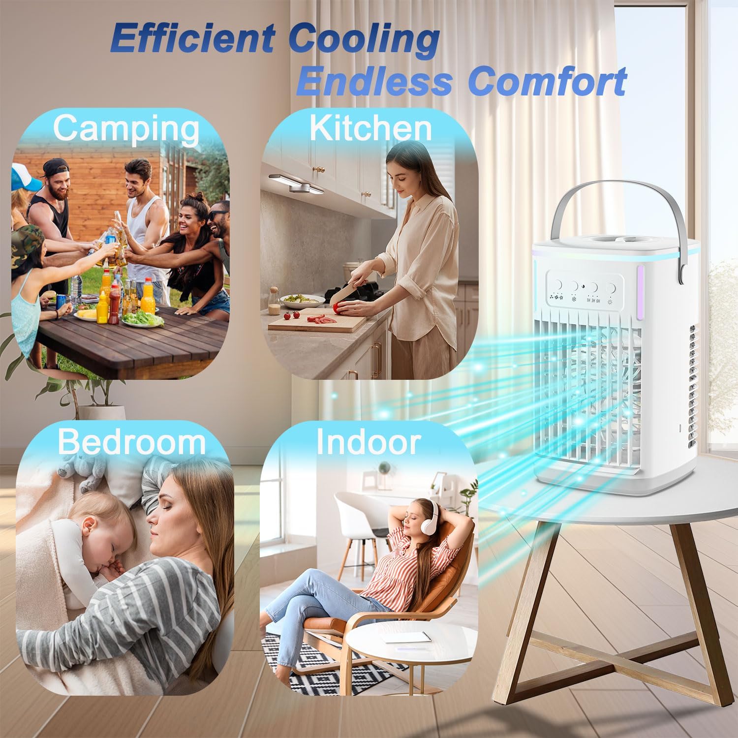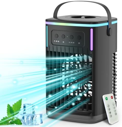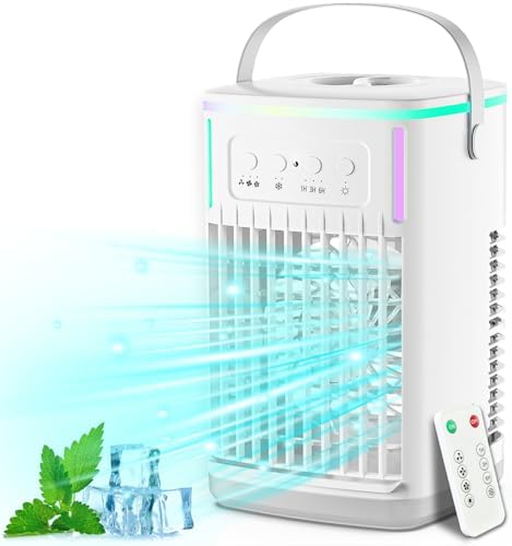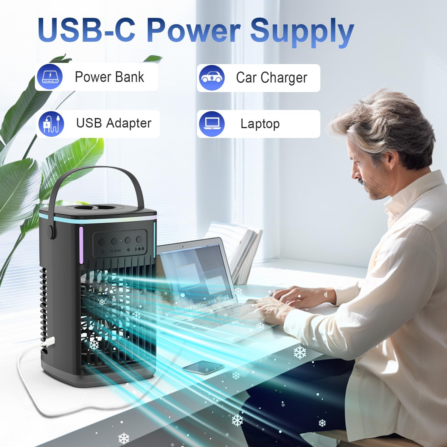 - ❄️【Remote Control & Easy Setup】Enjoy effortless cooling with this Small air conditioner, featuring a 16.4ft remote control to adjust modes, fan speeds, timers, and night lights from anywhere in your room. Designed for simplicity, it requires no complex installation—just add water, plug it in, position, and instantly cool your space. Stay comfortable with hassle-free operation day or night. The USB-C port can be powered by various sources like power banks, laptops, adapters and car chargers (Requires 5V/2A output)