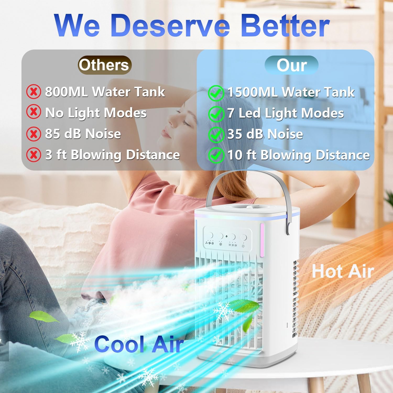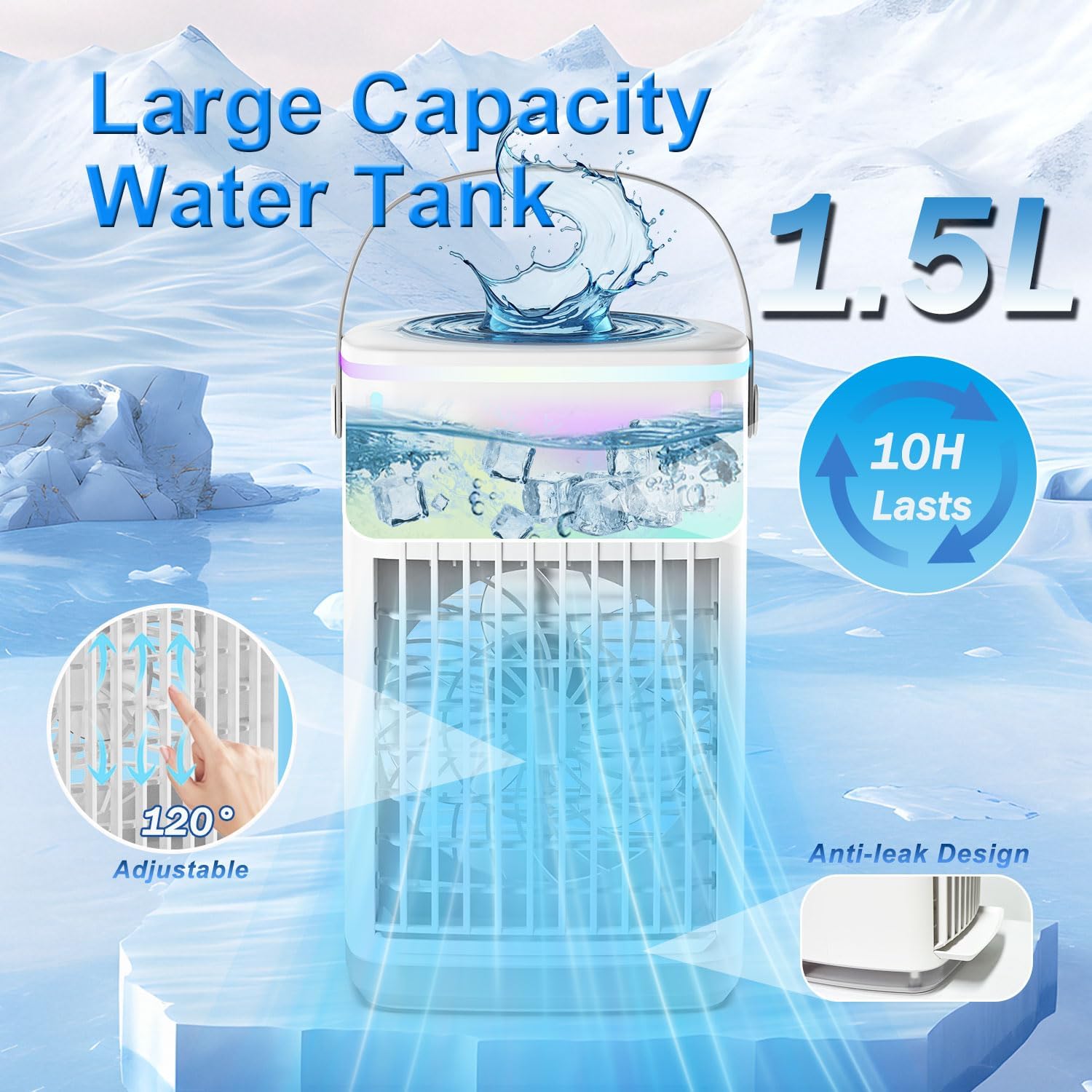 - ❄️【1500mL Large-Capacity Water Tank】This Personal Room Air Conditioner features a 1500mL (50 oz) sealed water tank, providing up to 10 hours of continuous operation on a single fill—no more frequent refilling. Enjoy fresh, cool air throughout the night. When the water tank empties, the system automatically switches to natural fan mode for self-protection, ensuring safe operation even while you sleep. The built-in water level window lets you easily monitor the tank status at a glance