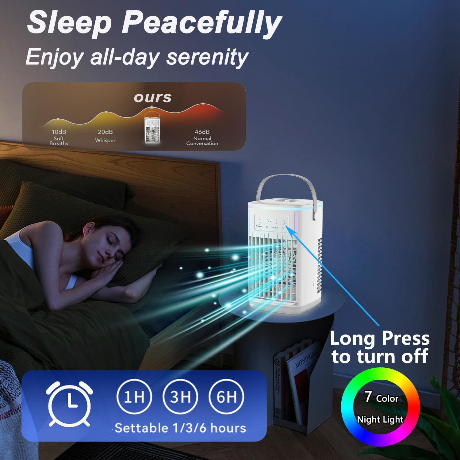 - ❄️【7-Color Night Light & Quiet Operation】This Mini Portable AC for the bedroom combines a professionally optimized air duct and fluid dynamics technology to deliver quiet cooling at just 35dB. The 7-color customizable night light enhances relaxation, creating a serene sleep environment—perfect for beating summer heat without compromising comfort