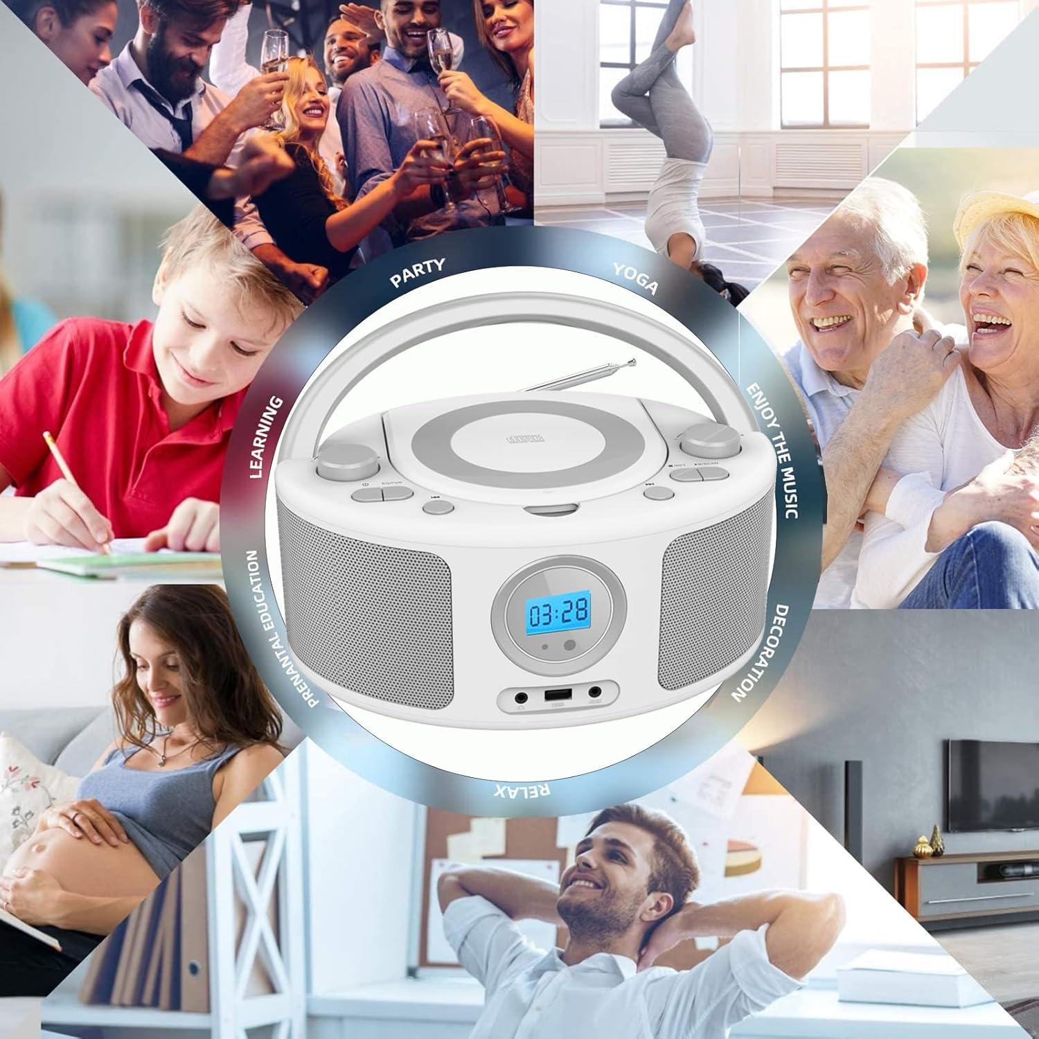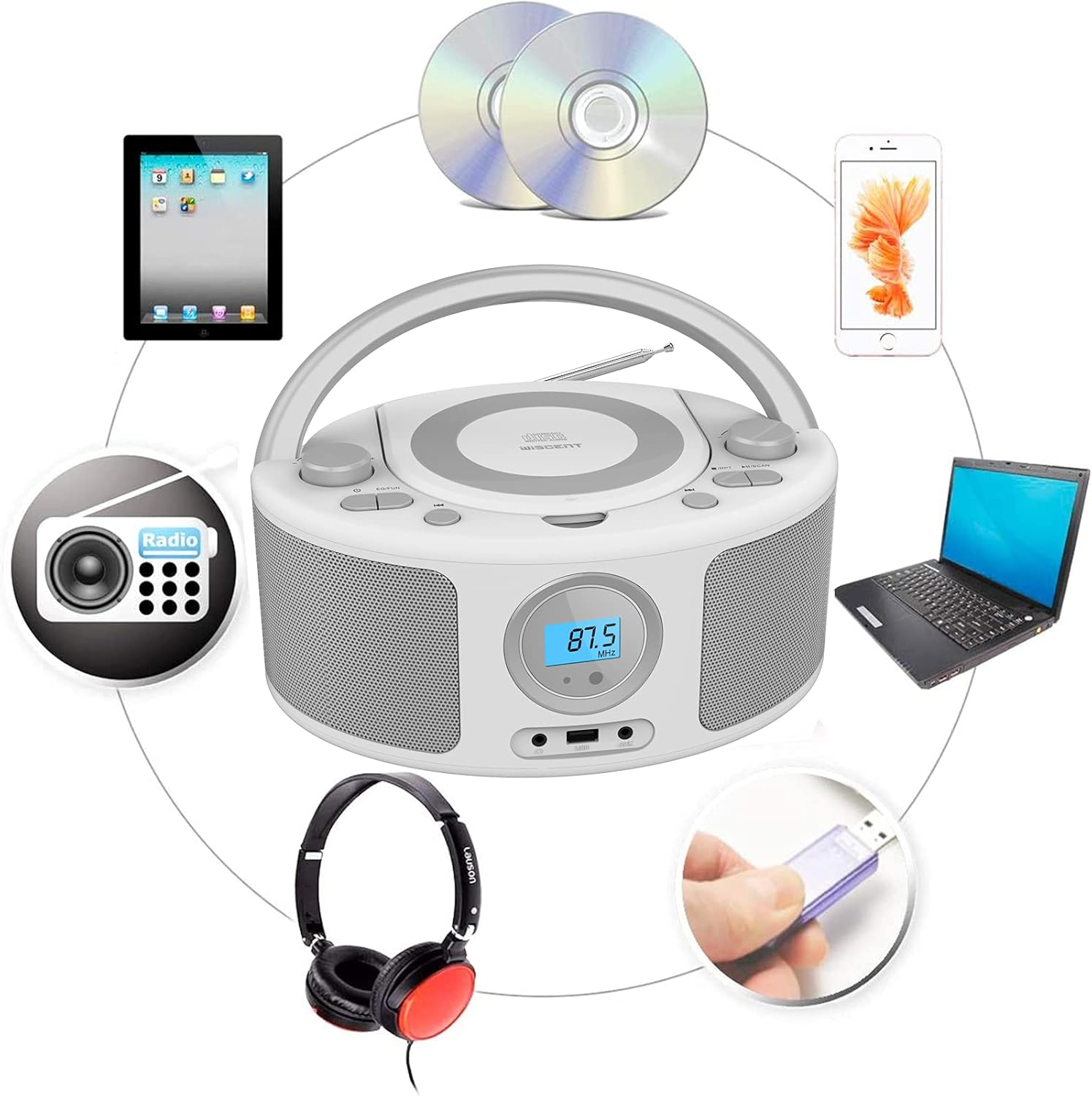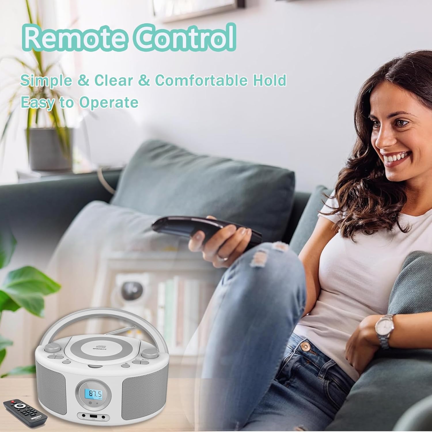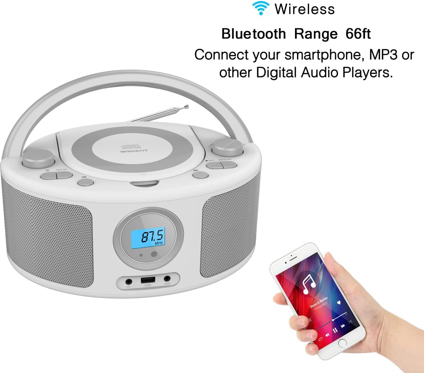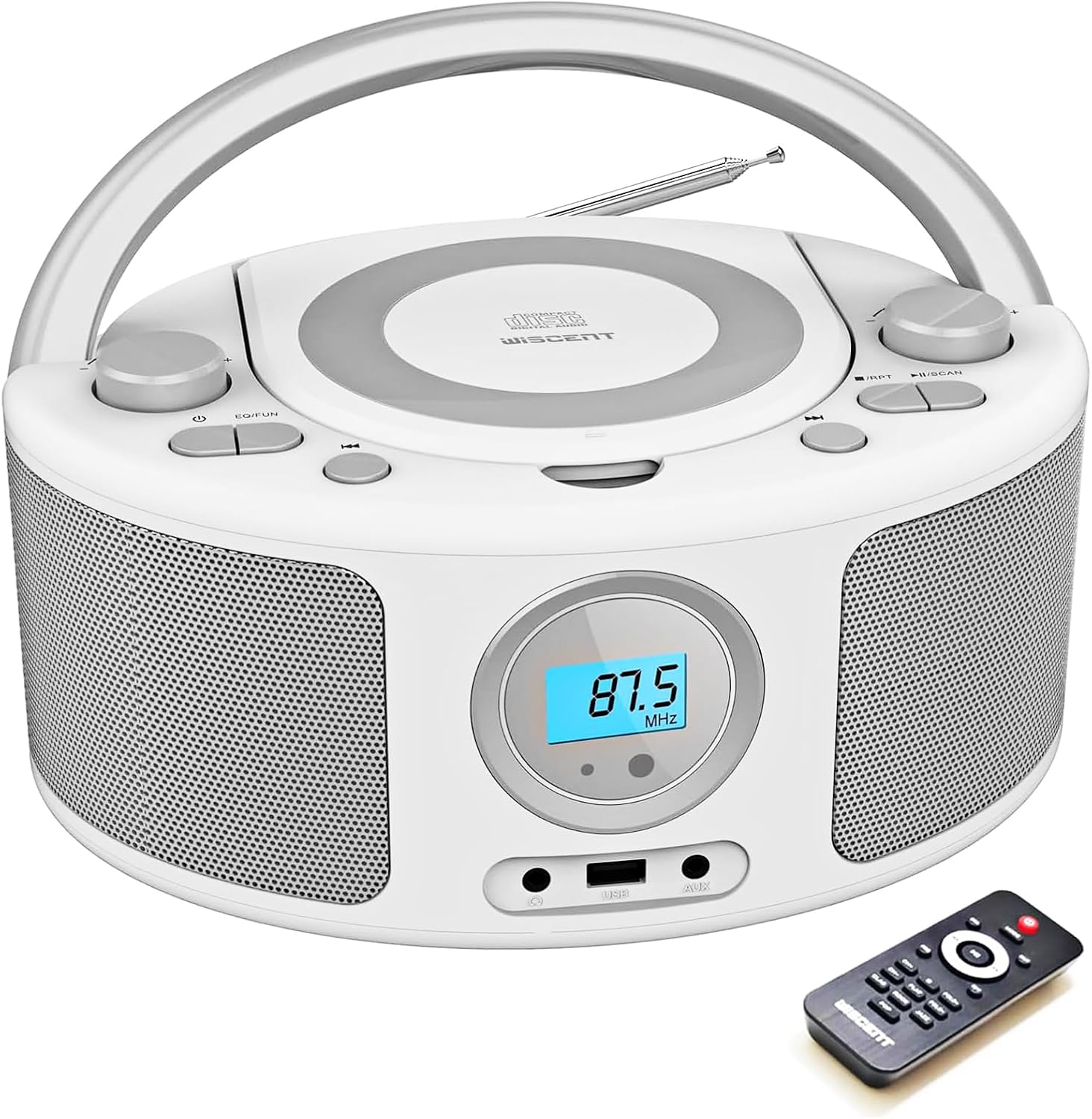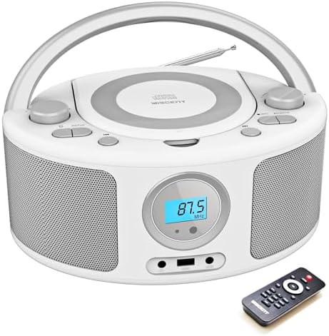 - Simple and Stylish Multi-function CD Radio Player with Remote: This cd boombox supports: 1.CD player, 2.FM radio, 3.Bluetooth speaker, 4.AUX player, 5.USB-MP3 player, 6. 3.5mm headphone jack. 7.Remote control for assisted operation. This CD boombox compact, simple, and stylish design, perfect for enjoying your favorite music at home or on the go.