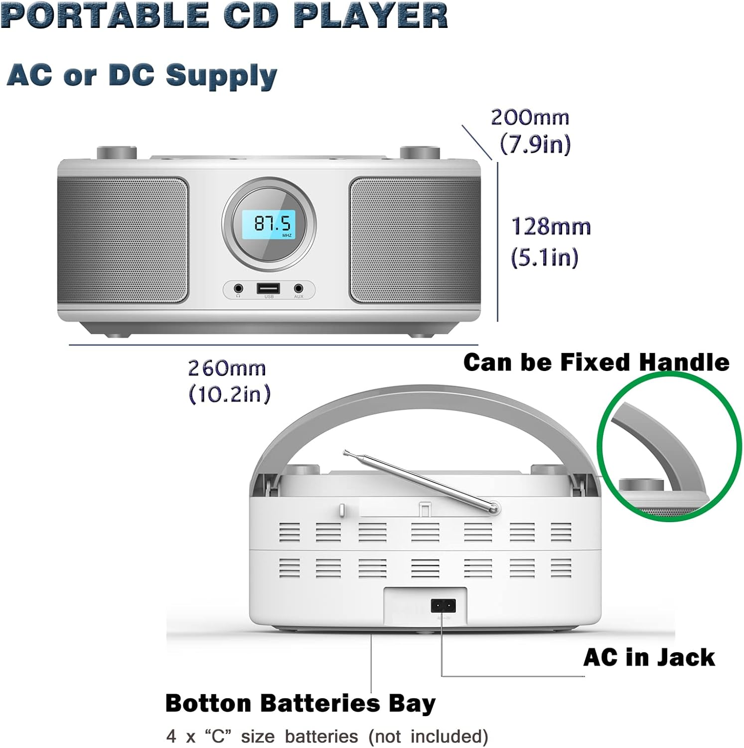 - FM Radio CD Player: Telescopic Antenna, Programmable Memory up to 30 presets saved.(NO AM radio)